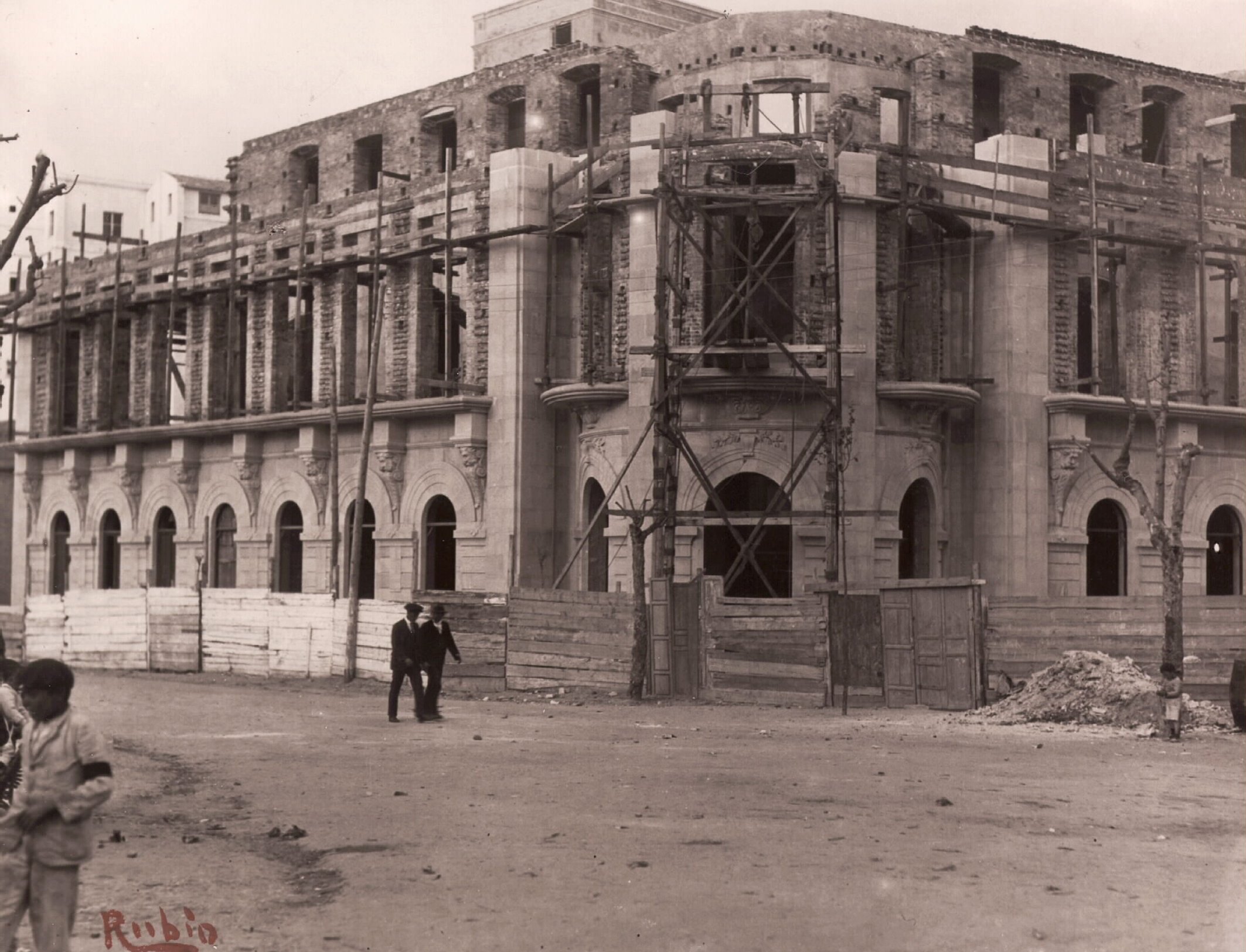 El edificio para la Junta Municipal de Ceuta en obras en 1924. Se encargó el proyecto en 1910 al arquitecto provincial José Romero y Barrero, se puso la primera piedra el 5 de agosto de 1914, finalizándose en 1926, bajo la dirección del arquitecto municipal Santiago Sanguinetti. Fotografía de Ángel Rubio. Real Biblioteca, Patrimonio Nacional, Madrid.