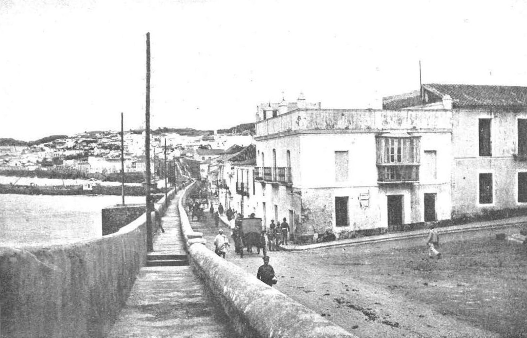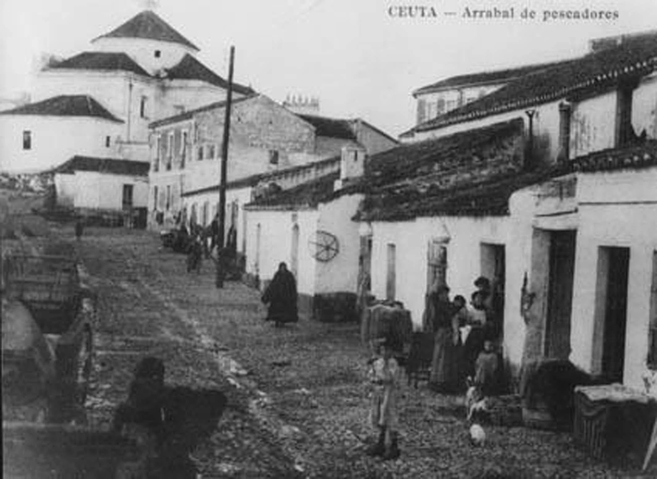 El barrio de pescadores de fines del siglo XIX, con la catedral al fondo y sus vecinos en la calle popularmente conocida como «La Brecha», actual calle Independencia. Fotografía Calatayud. Archivo General de Ceuta.