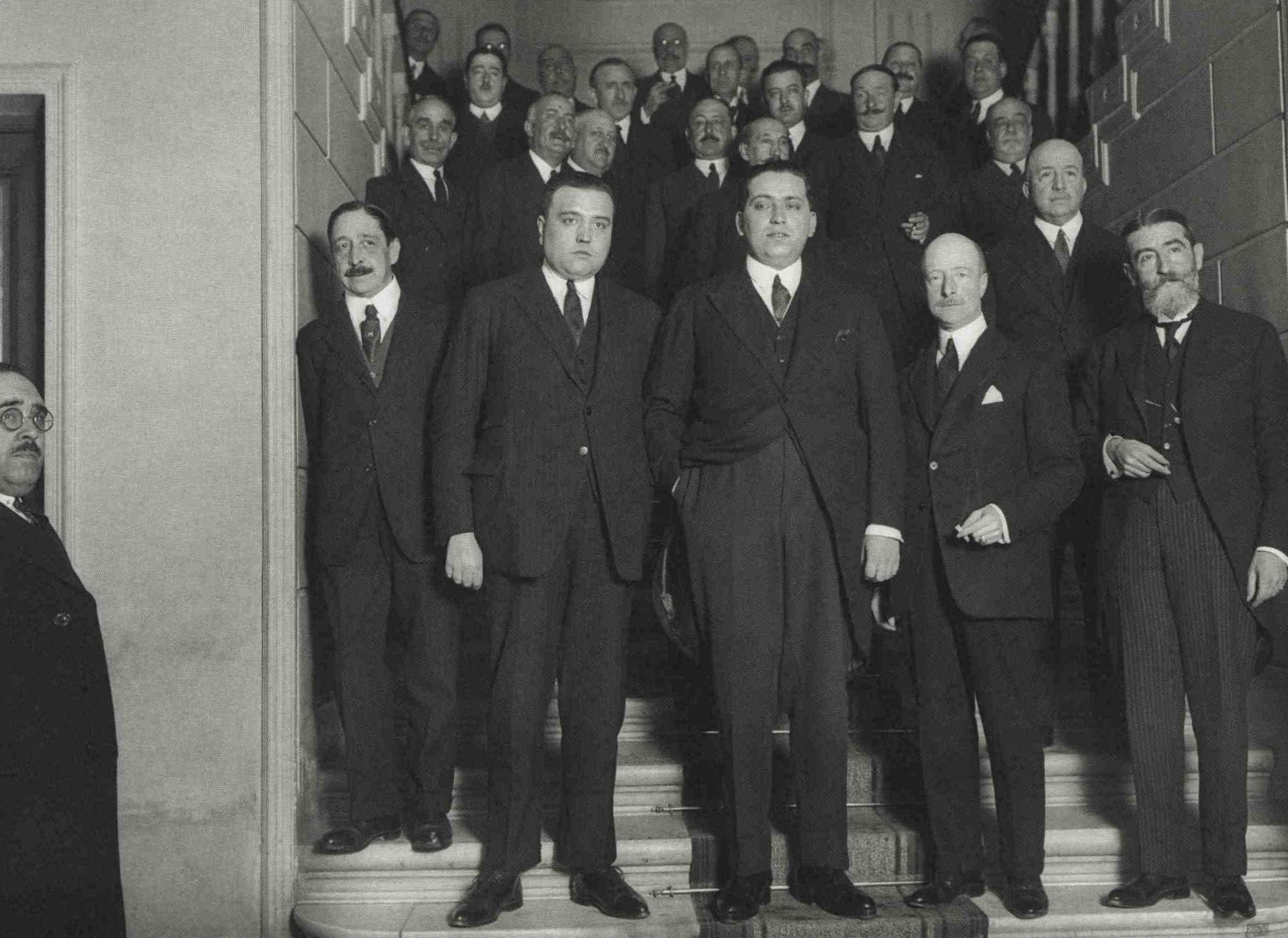 Los ministros José Calvo Sotelo (Hacienda), responsable del Estatuto Municipal, Eduardo Callejo de la Cuesta (Instrucción Pública y Bellas Artes) y Eduardo Aunós Pérez (Trabajo) en un acto público celebrado en Madrid. Fotografía de Marín, 1925. AA. VV, Marín, Fotografías 1908-1940, Madrid: Fundación Telefónica, 2008, p. 194.