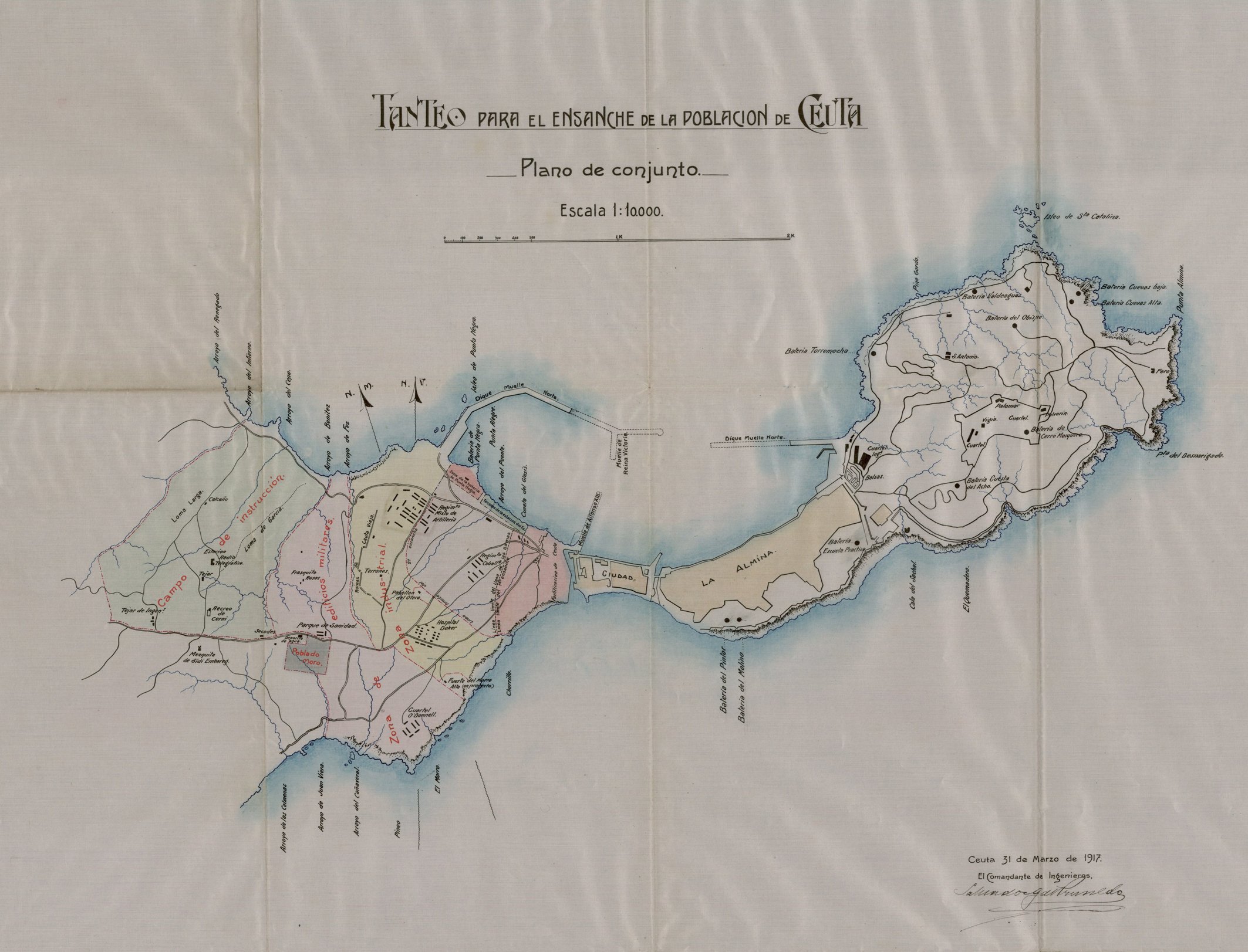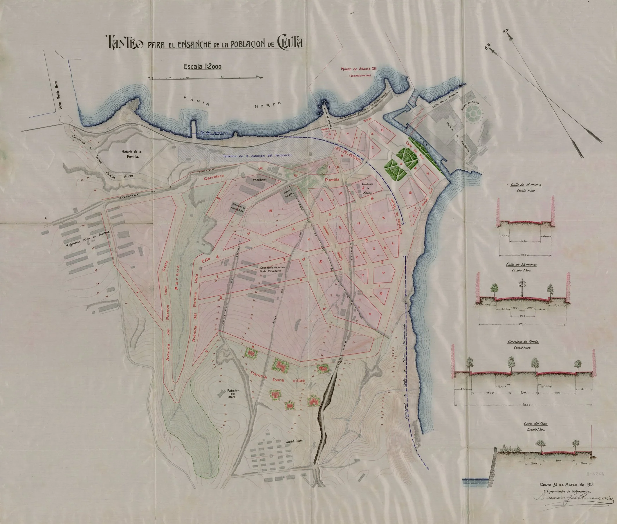 Propuesta de ensanche de Ceuta. Tanteo para el ensanche de la población de Ceuta, proyecto firmado por el comandante de ingenieros Salvador García de Pruneda, 31 de marzo de 1917. Real Biblioteca, Patrimonio Nacional, Madrid.