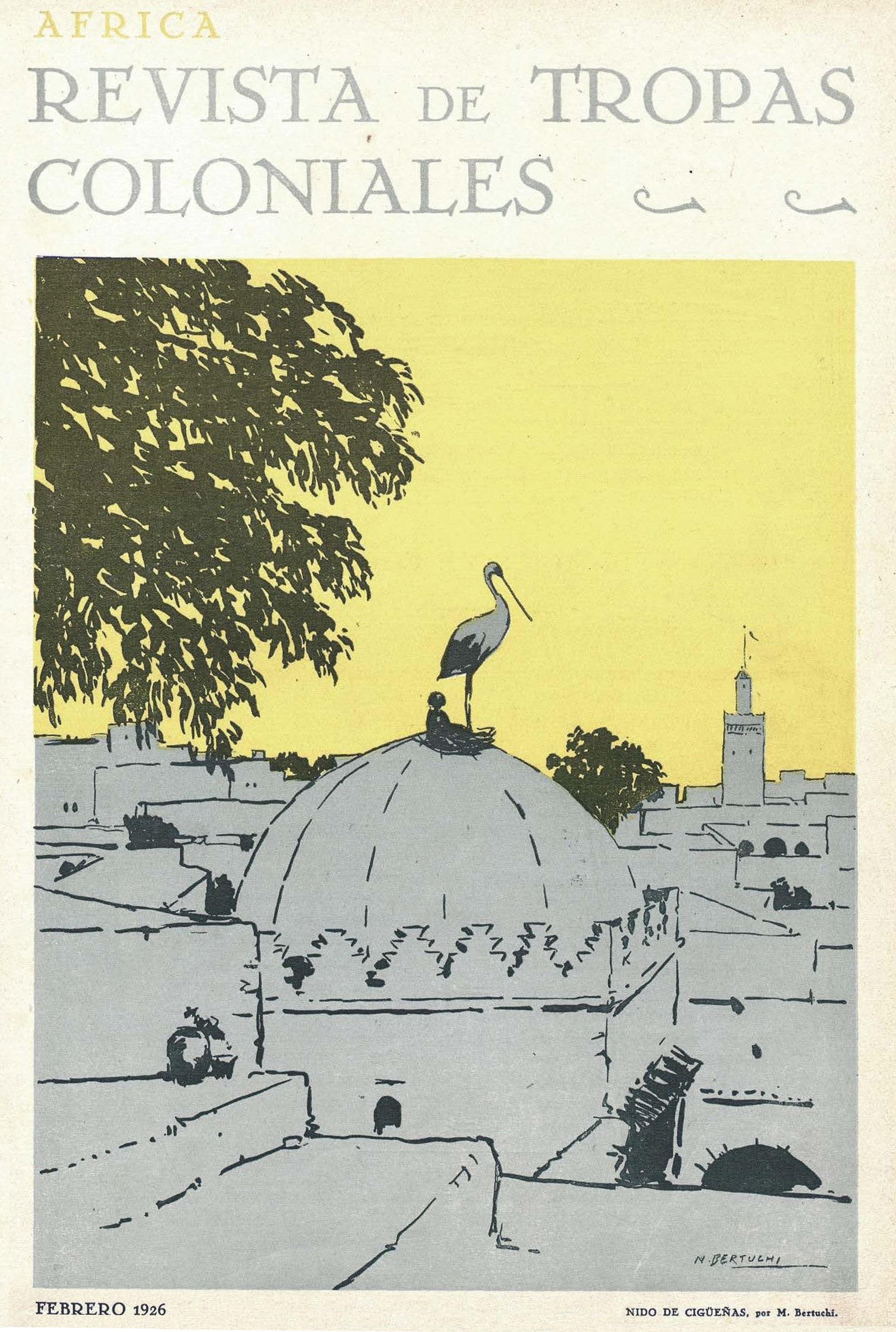 Portada de La Gaceta de África correspondiente al número monográfico dedicado a ciudades de Marruecos (arriba). «Nido de cigüeñas», por Mariano Bertuchi, portada del primer número de la Revista de Tropas Coloniales, publicada en 1926 y dirigida por Francisco Franco. Se definía como revista de difusión de estudios hispano-africanos (abajo).