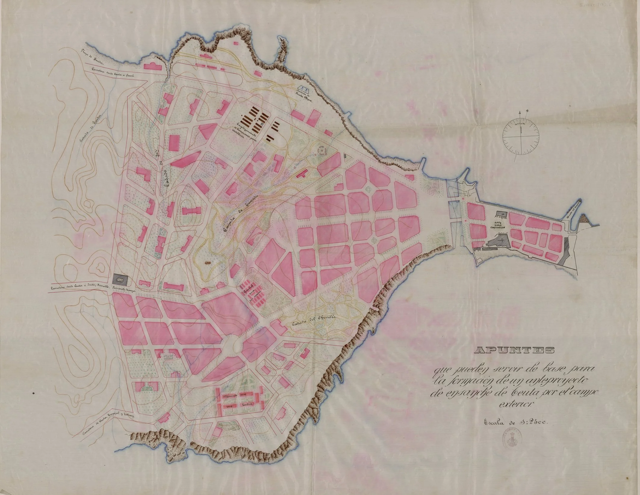 «Plano de la ciudad de Ceuta y de su Campo Exterior hasta Jadú en los Altos del Otero» y «Apuntes que pueden servir de base para la formación de un anteproyecto de ensanche de Ceuta por el Campo Exterior», son los títulos de las cartografías de una propuesta anónima de ensanche para Ceuta. Aunque no está datada, se podría situar a finales del siglo XIX, dado que en ella aparece reflejado, a nivel de emplazamiento, el hospital militar Docker y en la misma cartografía estaba esbozaba la propuesta del Cuartel de los 1000 hombres, que se realizó durante la primera década del siglo XX. Evidentemente, no existe referencia alguna ni al trazado de la vía férrea ni a la primera ampliación del puerto, realizados ya entrados en la primera década del siglo XX.