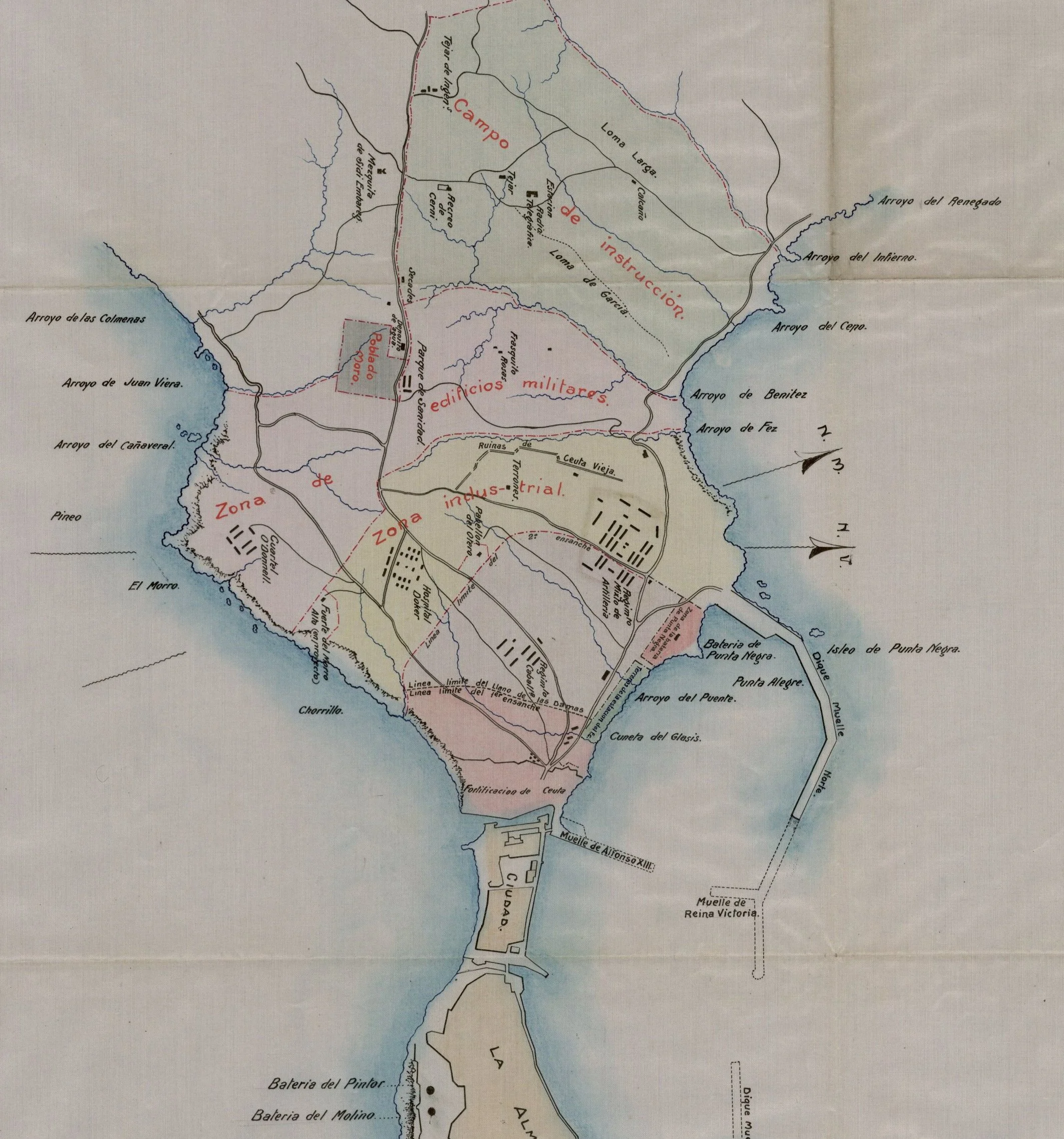 Según aparece referenciado en la Real Orden de Guerra de 1911, el ejército abogaba por la realización de un ensanche para la ciudad de Ceuta, por lo que con la ley de 15 de julio de 1912 se procedió a la adquisición del llamado Llano de las Damas27, formado por los terrenos del Campo Exterior más próximos a la ciudad. La primera hoja cartográfica, a escala 1/10.000, establecía una propuesta de extensión de la ciudad en una zonificación en forma de arcos a partir del Foso. Esta zona consistía en un primer ensanche, que se desarrolla a nivel de proyecto en una segunda hoja a escala 1/2.000, y llega hasta el Llano de las Damas; un segundo ensanche, sin posibilidad real de intervención debido a temas fundiarios, al igual que sucedía con la siguiente franja, la zona industrial. Esta zona industrial conectaba directamente con el puerto en el dique Norte, ampliado en 1913, de modo que se favoreciera la exportación. La superficie situada más al exterior era ocupada por el estamento militar, distinguiendo entre una zona de edificios militares más próxima a la ciudad, a cuyo límite se situaba el “poblado moro” y una zona más alejada destinada a campo de instrucción. Se conformaba así una franja militar de protección en el Campo Exterior, solución que por otra parte parecía bastante obvia debido a la inestabilidad bélica en el entorno hasta la pacificación de 1927.