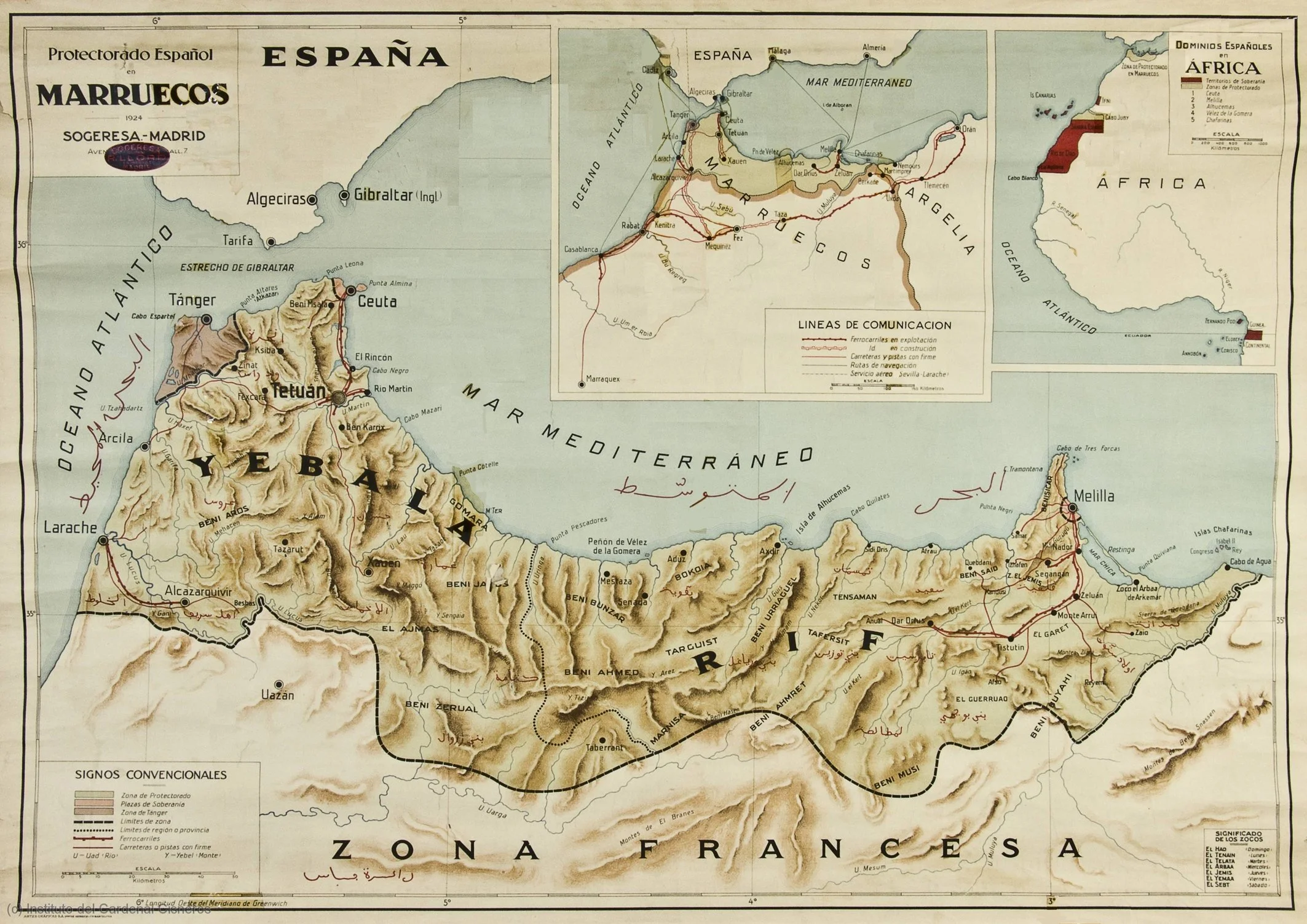 Protectorado español en Marruecos y posesiones españolas (1924). Mapa entelado destinado a uso escolar. Madrid: Sogeresa (Sucesor) R. Llord, 1924. Barcelona: Artes Gráficas S. A. Henrich y Cía. Toponimia en español y árabe. Instituto de Educación Secundaria Cardenal Cisneros, Madrid.