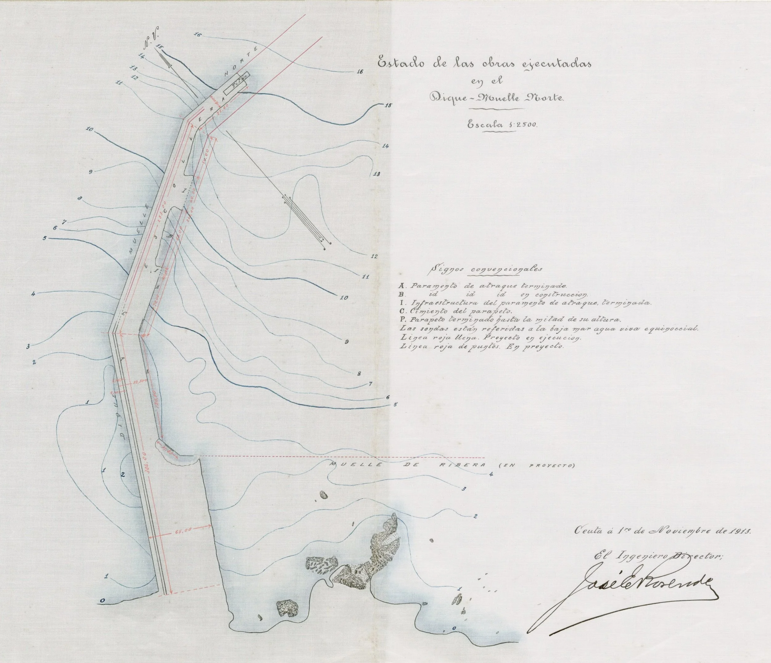 Obras del dique de muelle norte del puerto de Ceuta, 1913. Se observa la superficie prevista ganar al mar con el denominado Muelle de Ribera. Real Biblioteca, Patrimonio Nacional, Madrid.