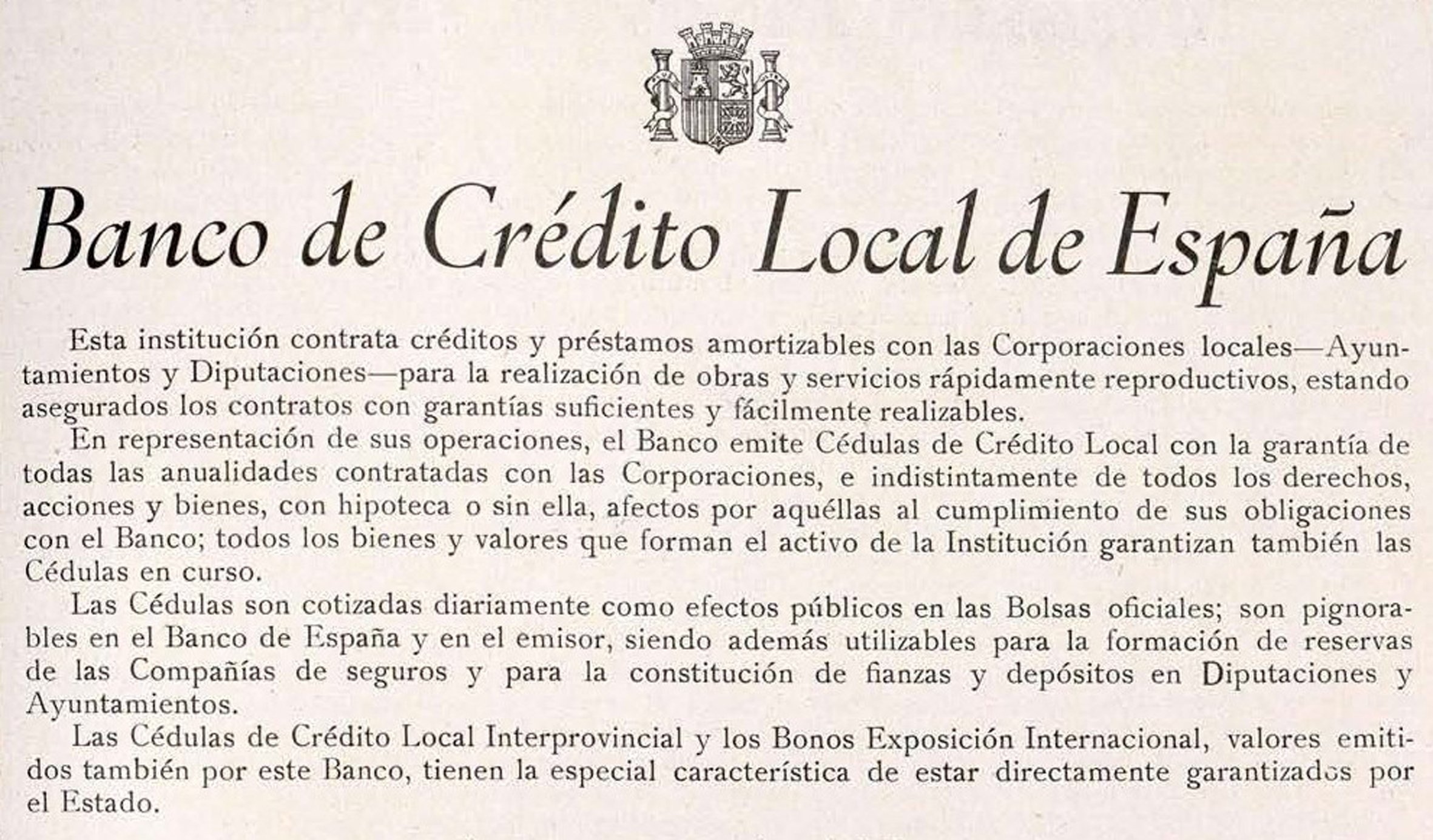 Publicidad del Banco de Crédito Local de España, sociedad anónima creada en 1925 con el objeto de financiar a entidades locales, participando en su formación tanto instituciones públicas como privadas. Permitía financiar los proyectos municipales derivados del cumplimiento del Estatuto Municipal.