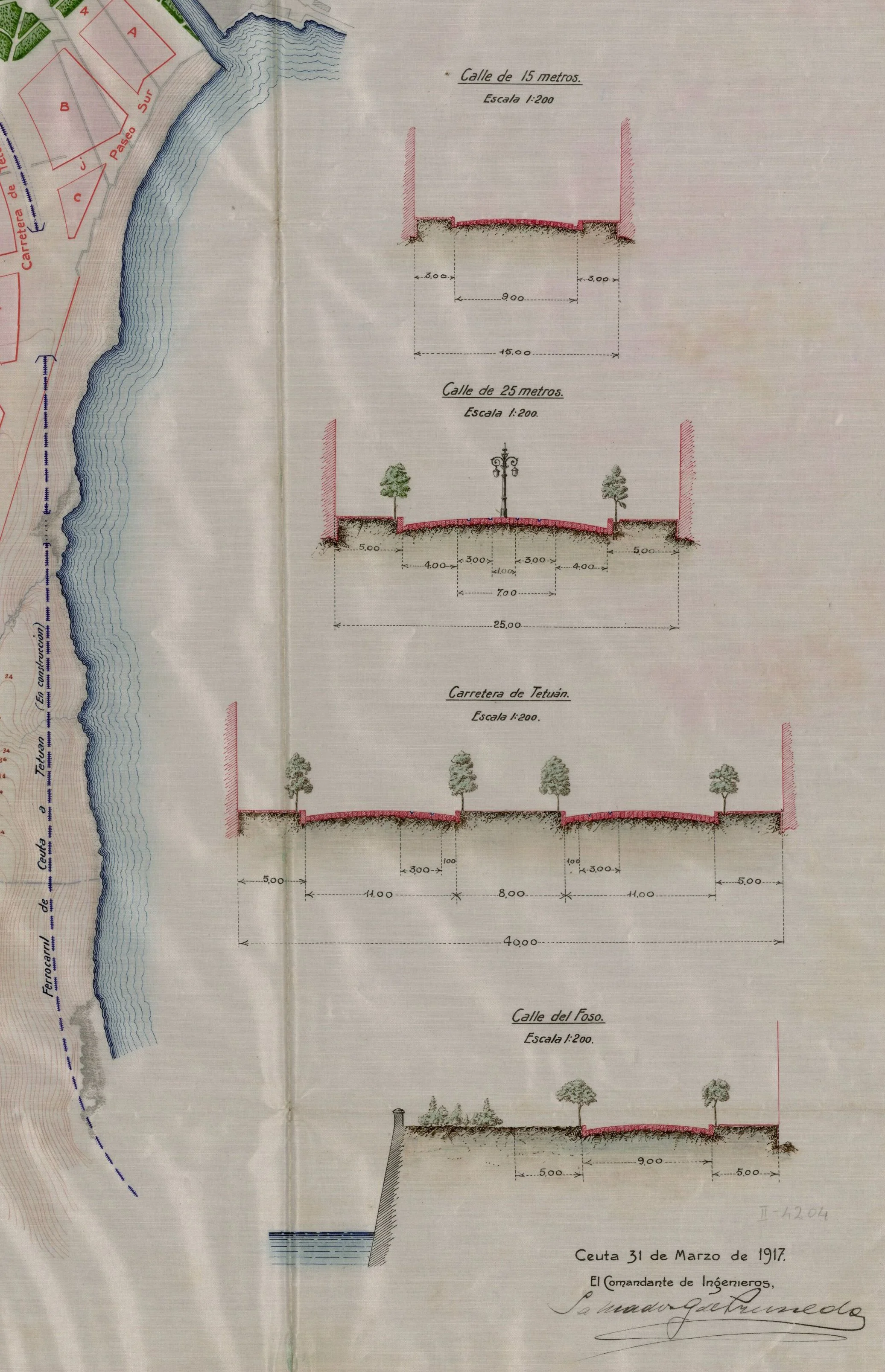 Detalle de los viarios propuestos. Tanteo para el ensanche de la población de Ceuta, proyecto firmado por el comandante de ingenieros Salvador García de Pruneda, 31 de marzo de 1917. Real Biblioteca, Patrimonio Nacional, Madrid.