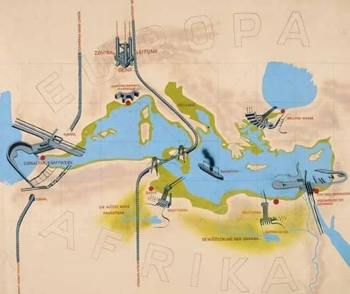 Mapa general de Atlantropa: obras de Gibraltar con presa y central eléctrica, nuevos terrenos, irrigación del Sahara, túnel para ferrocarril Londres-Dakar, puente para ferrocarril Berlín-Ciudad del Cabo, línea central, 1932. Deutsches Museum.
