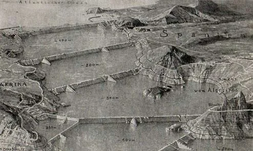 En base a estas teorías, a finales de 1927 Sörgel comenzó a trabajar en su proyecto de Panropa, más tarde renombrado como Atlantropa. Sobre la base de los resultados de Jessen, Sörgel ideó un plan para transformar toda la región del Mediterráneo. El proyecto consistía en la construcción de una gran presa hidroeléctrica de 35 kilómetros de longitud a través del estrecho de Gibraltar para evitar la entrada de agua desde el Atlántico, de una segunda presa a través de los Dardane- los para cortar el flujo de agua desde el mar Negro y de una tercera represa entre Sicilia y Túnez, que debería dividir el Mediterráneo en dos. Con ello se generaba, aparte del desarrollo agrícola que suponía el reparto del excedente de agua por el desierto sahariano, una ingente cantidad de energía eléctrica, verdadero motor de los tiempos modernos.