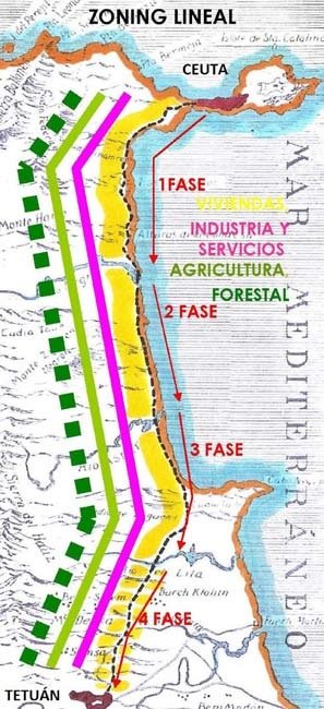 El referente inmediato de la Ciudad Lineal de Ceuta-Tetuán era, sin lugar a du- das, la Ciudad Lineal de Madrid, cuyas dimensiones básicas mantenía la propuesta norteafricana, aunque en el caso madrileño, a diferencia del anterior, se construyó, como estaba previsto, un frente de manzanas a ambos lados de la vía principal de comunicación. La vía se convertía en un eje de simetría y no se establecía zonificación alguna. No hay que perder de vista que el principio que regía la propuesta madrileña, la vivienda en un entorno higiénico, no era el mismo que soportaba la propuesta norteafricana, fundamentado en la colonización territorial.