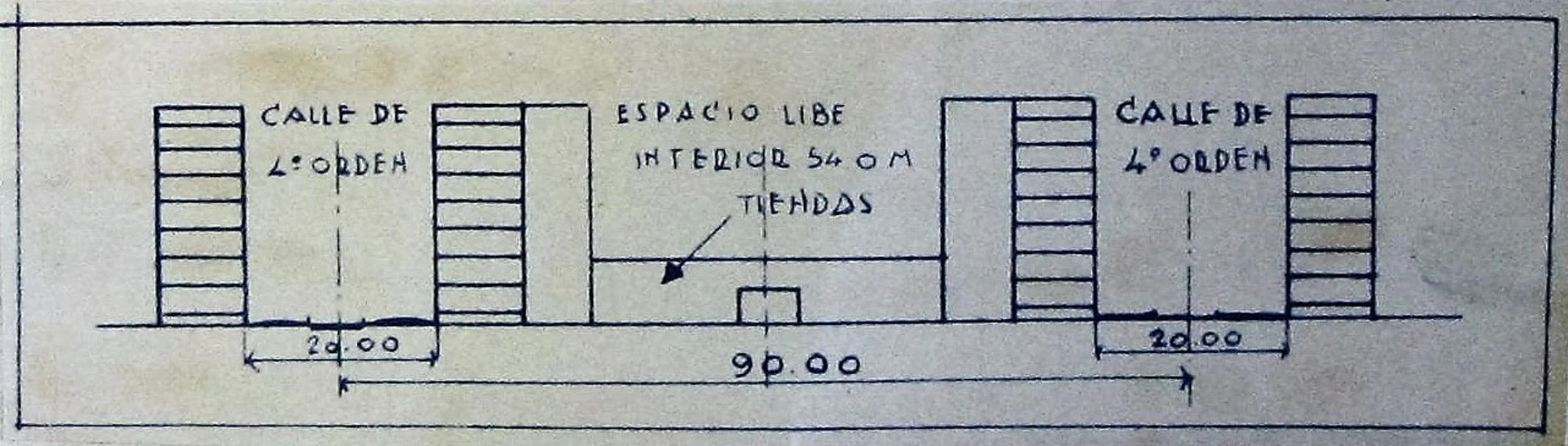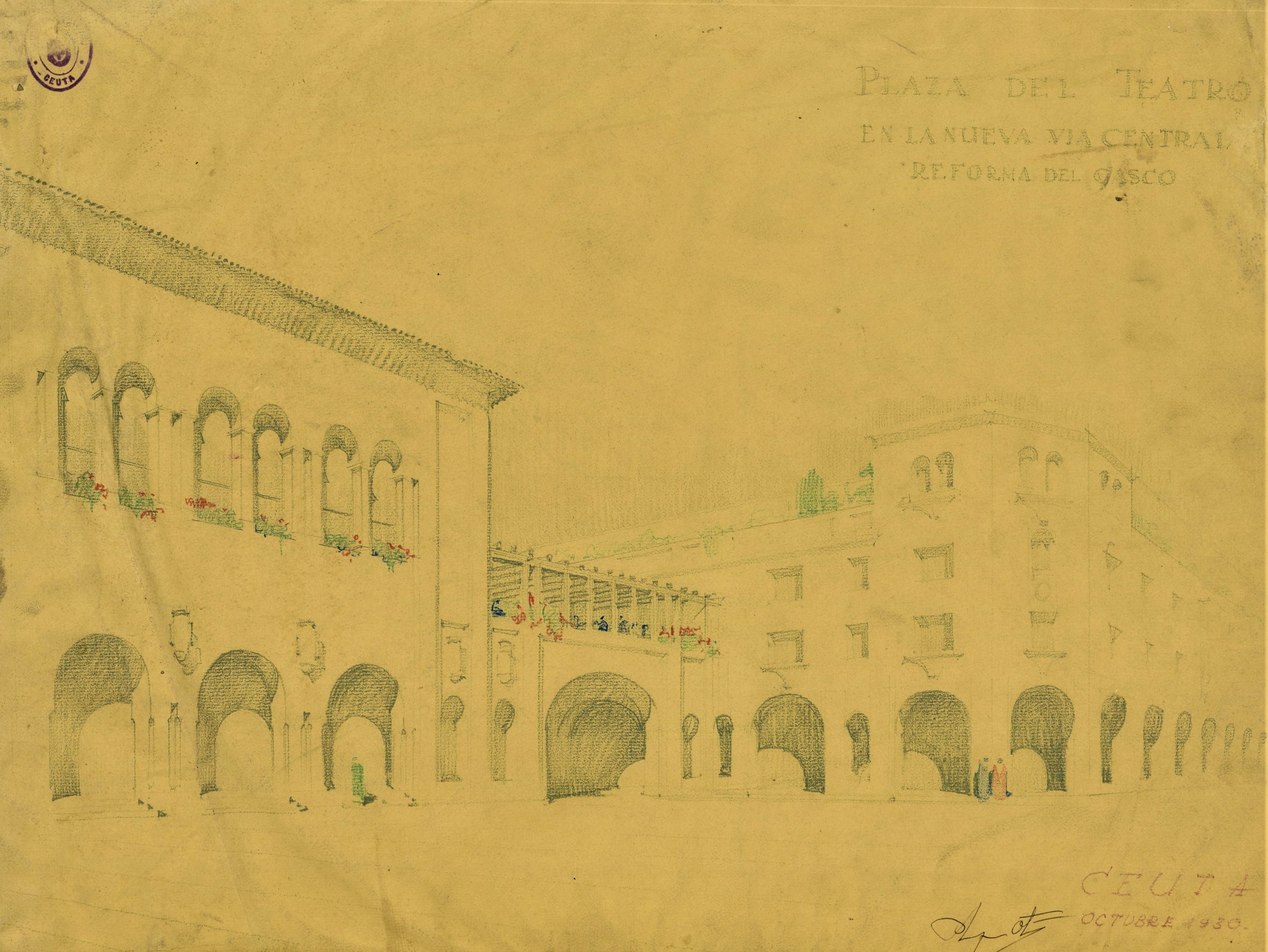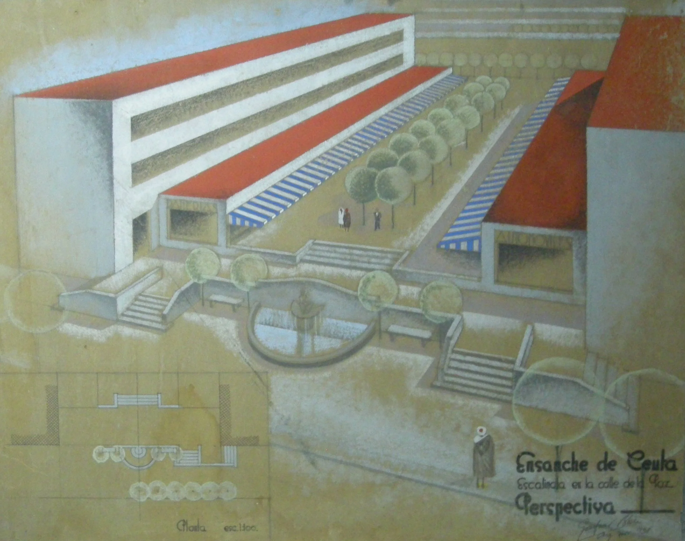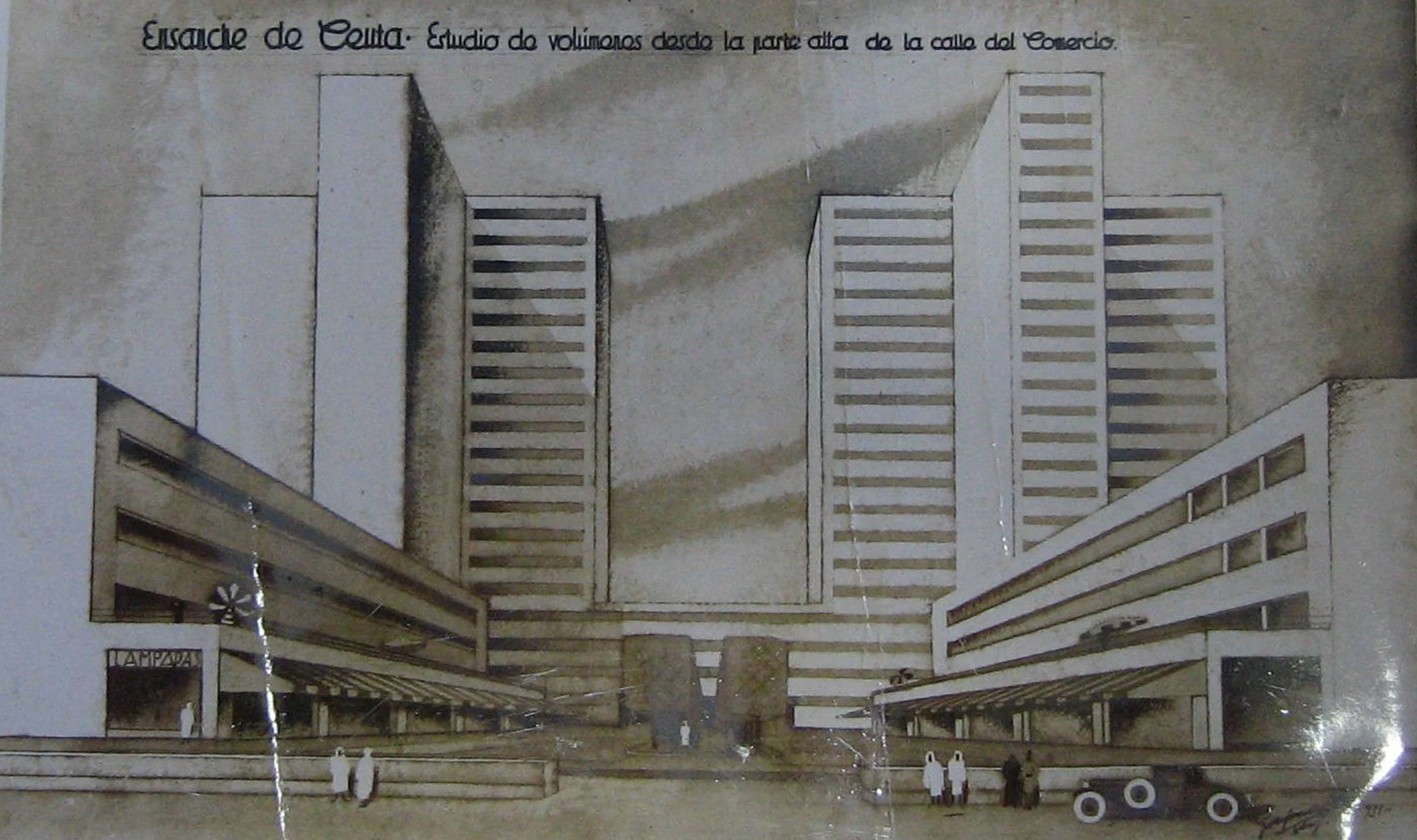 Perspectiva y secciones del nuevo centro de actividad comercial de Ceuta, del proyecto de ensanche de Ceuta de Gaspar Blein, 1931. Archivo General de Ceuta.