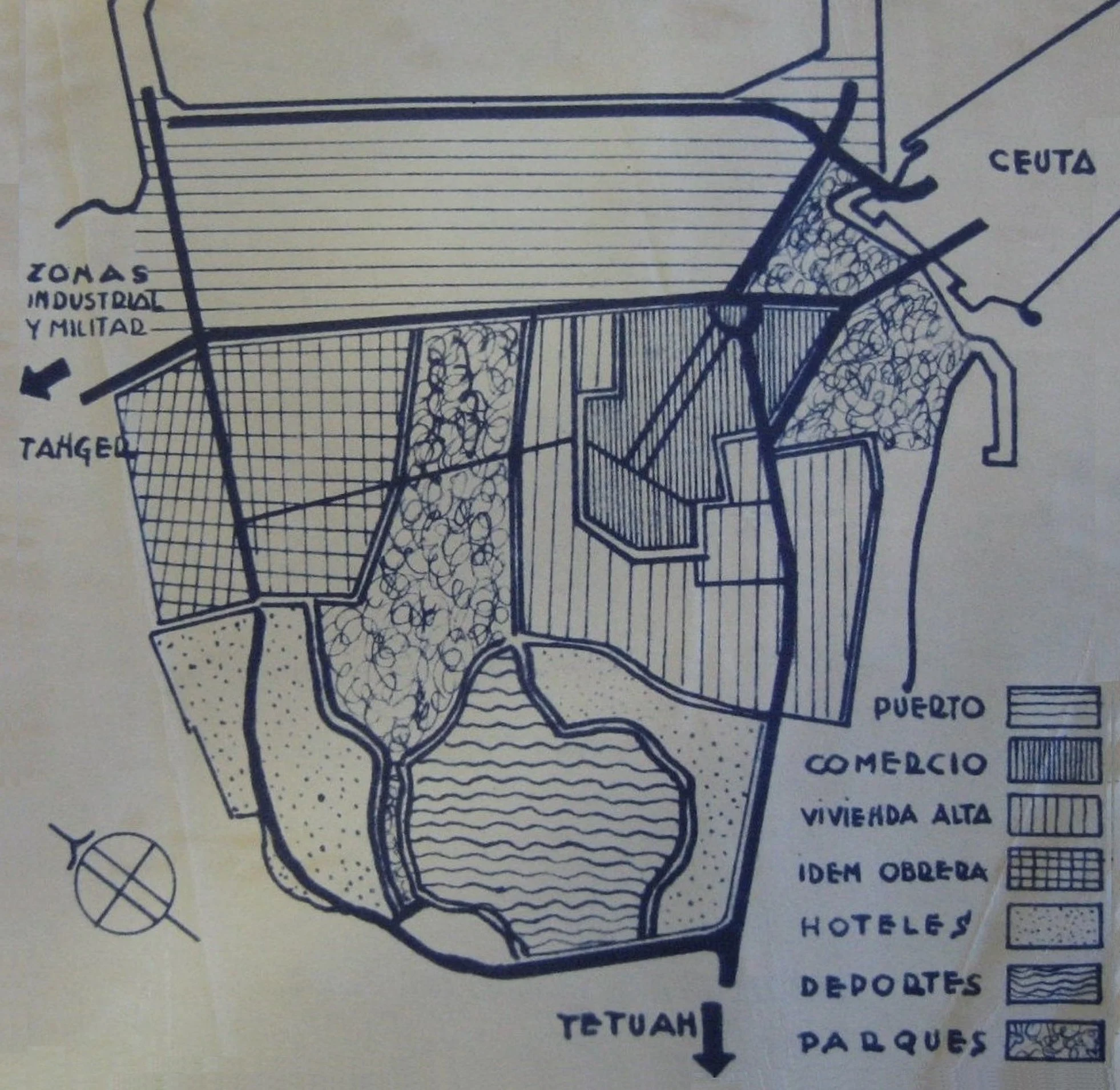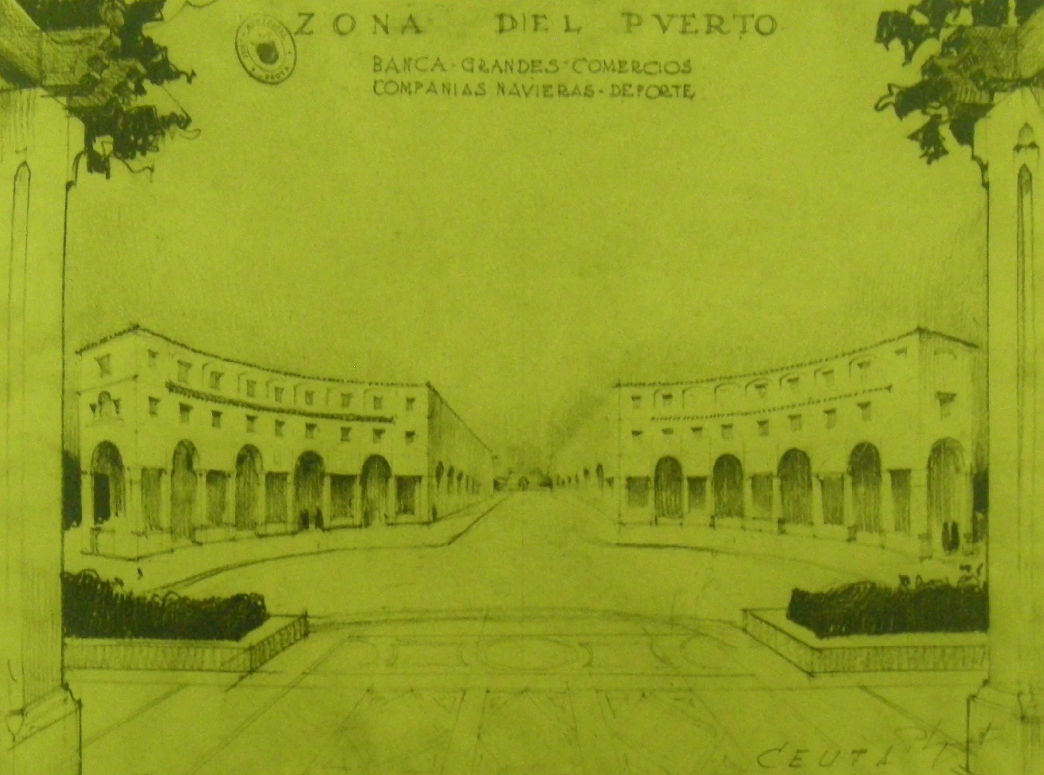 La propuesta del equipo de Muguruza para Ceuta partía de una composición urbana de tipo académico en base a unos claros ejes viarios que intentaban adaptarse tanto a las preexistencias como a la pronunciada orografía, que se salvaba cuando era necesario mediante la construcción de un viaducto y el escalonamiento de las calles secundarias. Las manzanas eran irregulares excepto las de la zona de ampliación de puerto, donde propuso una trama ortogonal. Banca, compañías navieras y deportes son los usos asignados a este entorno. El gran eje perpendicular al mar de la zona del ensanche portuario se convertía en el más significativo de su propuesta. Paralelo al mar proyectó un paseo formado por una doble fila de árboles. La nueva edificación tenía forma de bloques lineales de 2-3 alturas con una sucesión de arcadas en doble plano de fachada en su planta baja a modo de soportales, que daban lugar a un marcado juego de sombras. En lo que respecta a la operación de reforma interior, se basaba en la rectificación del viario existente y en la continuidad del frente edificado. Propuso también la apertura de una nueva puerta en la muralla, con un marcado aire renacentista, para facilitar el acceso al casco urbano desde la zona de ensanche de la ciudad. El nuevo puente se continuaba como eje principal en la plaza de África. El acceso existente se mantenía como paso directo al puerto y a la nueva zona de ensanche del puerto.