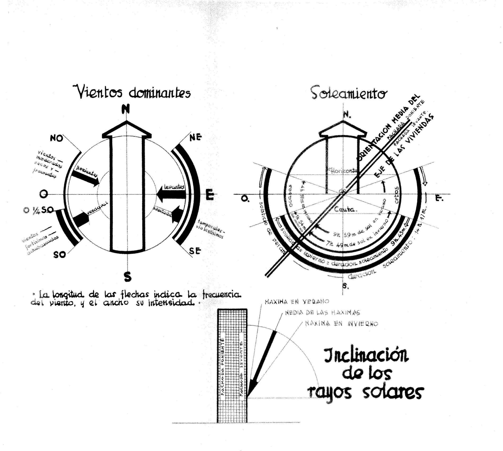 Estudio de vientos y soleamiento, factores en los que Gaspar Blein justifica las decisiones sobre diseño urbano de su propuesta. Archivo General de Ceuta (arriba) y detalles de representaciones gráficas de estudios estadísticos de densidades: población y superficies (abajo), 1930. Archivo General de Ceuta.