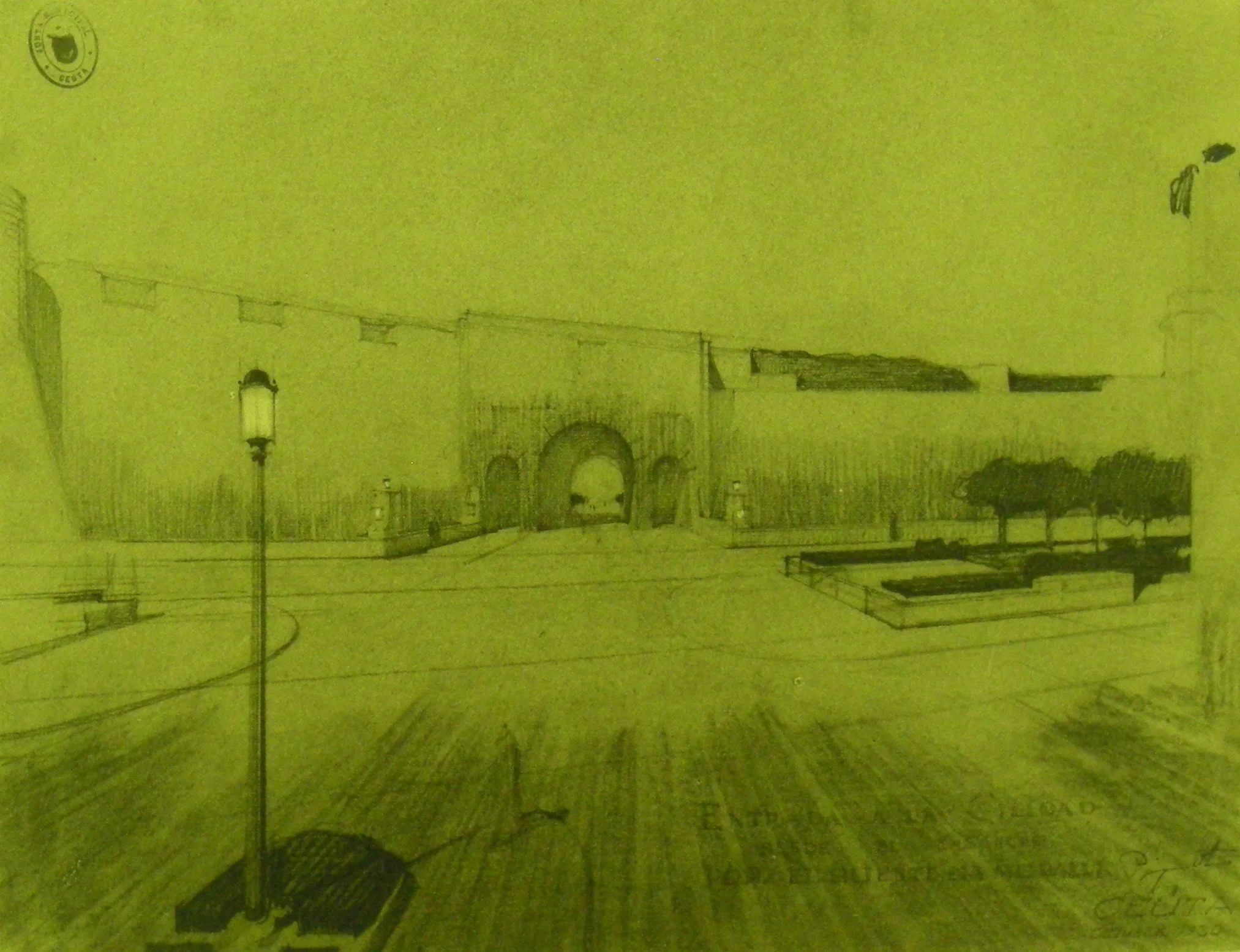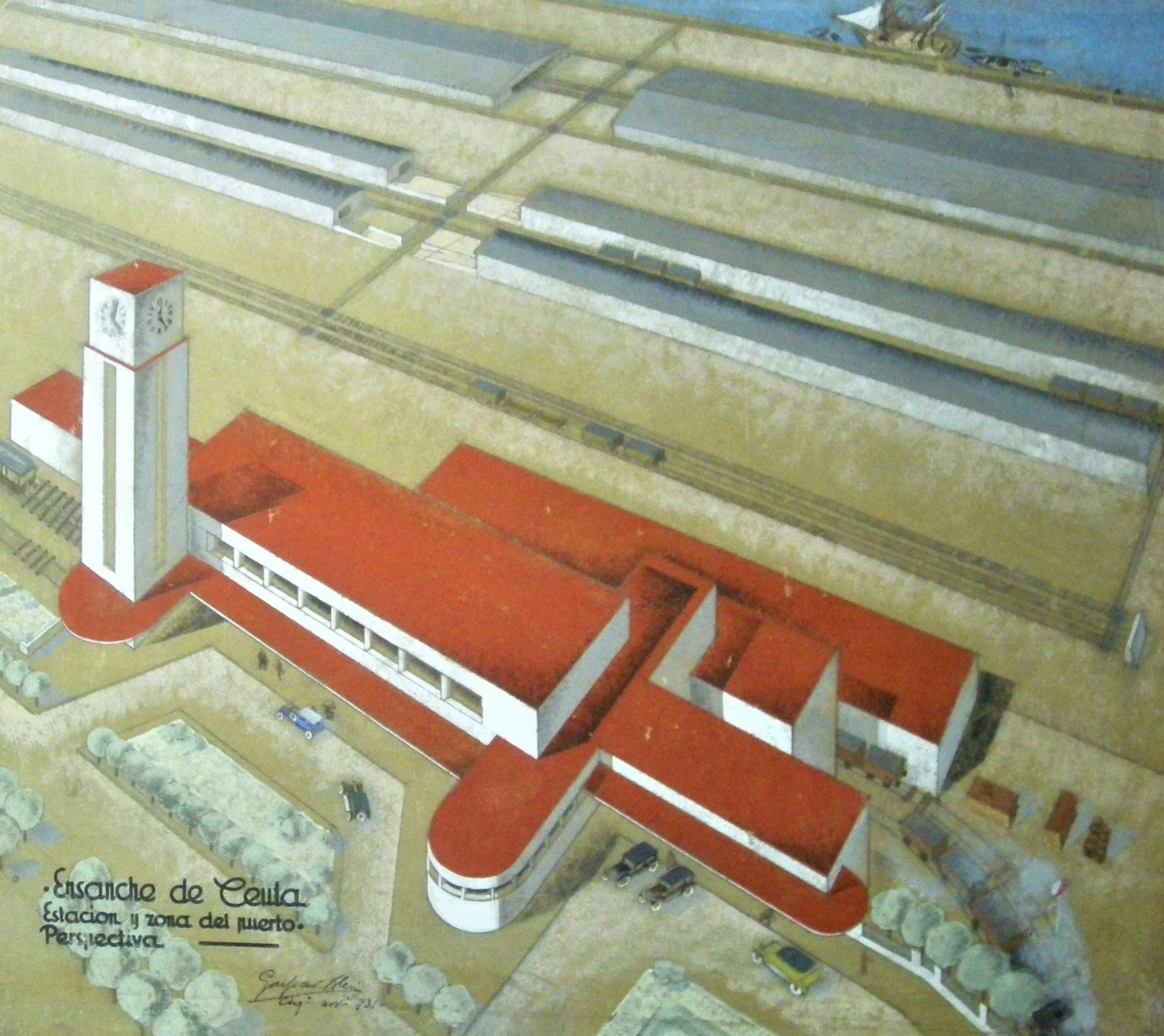 Perspectivas de la zona de puerto y del edificio de la estación del ferrocarril correspondiente al proyecto de ensanche de Ceuta de Gaspar Blein, 1931. Archivo General de Ceuta.