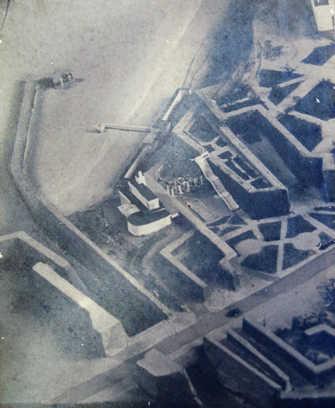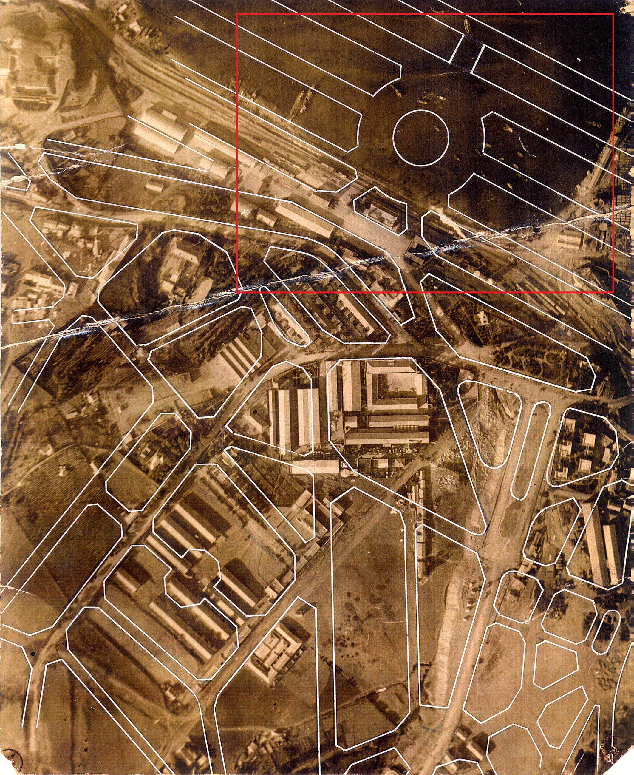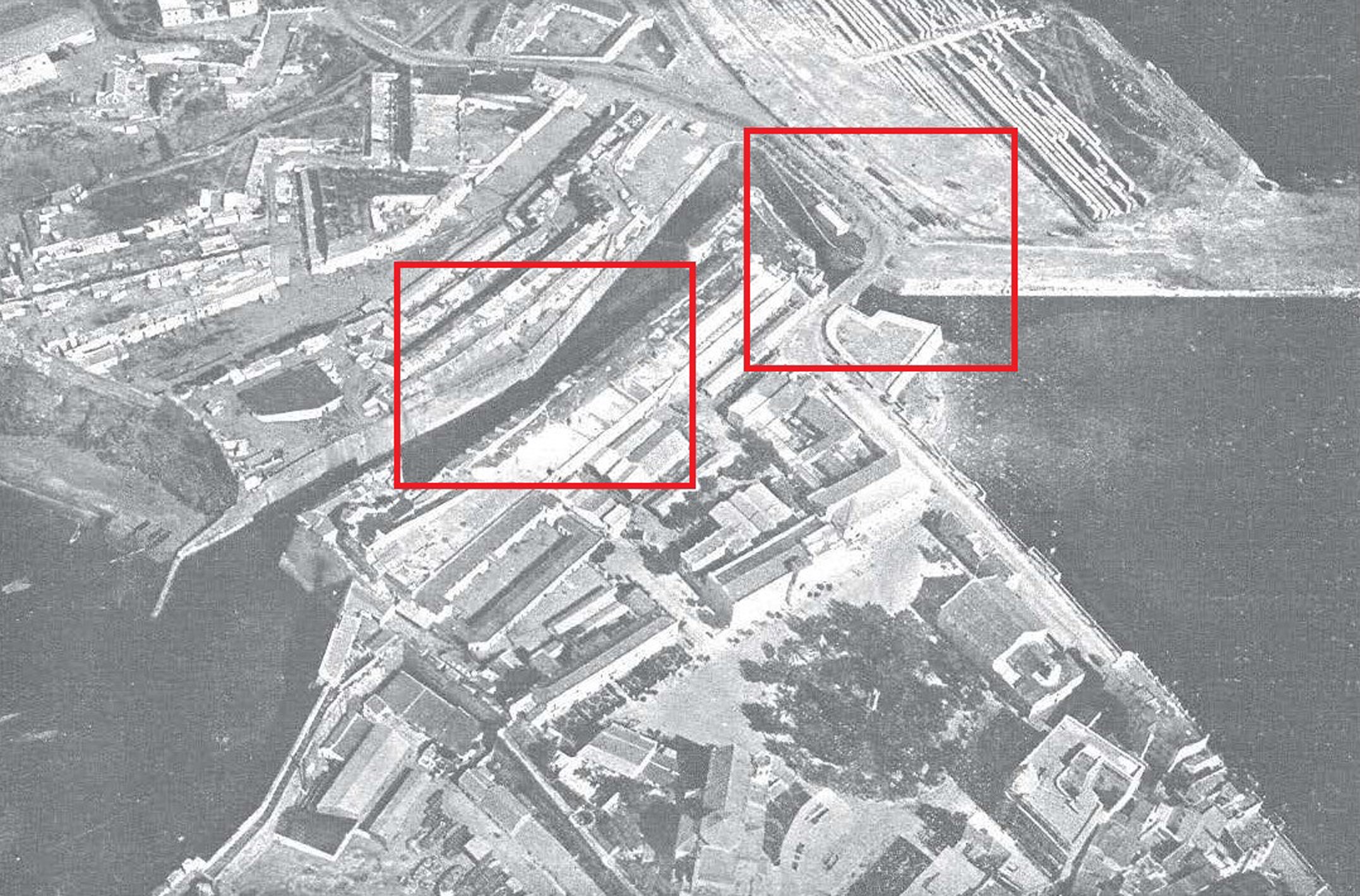 Detalle de la superposición del anteproyecto de reforma interior y ensanche de Ceuta de Pedro Muguruza sobre una fotografía aérea de la zona de ensanche sobre el terreno ganado al mar en la zona del puerto, 1930. Archivo General de Ceuta.