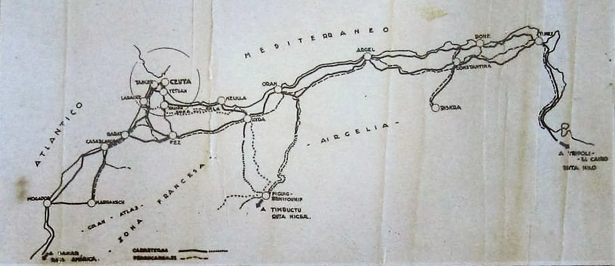Sistema de transporte a escala regional presente en la memoria del anteproyecto de la propuesta de Gaspar Blein para el concurso de urbanización de Ceuta, 1931. Archivo General de Ceuta.