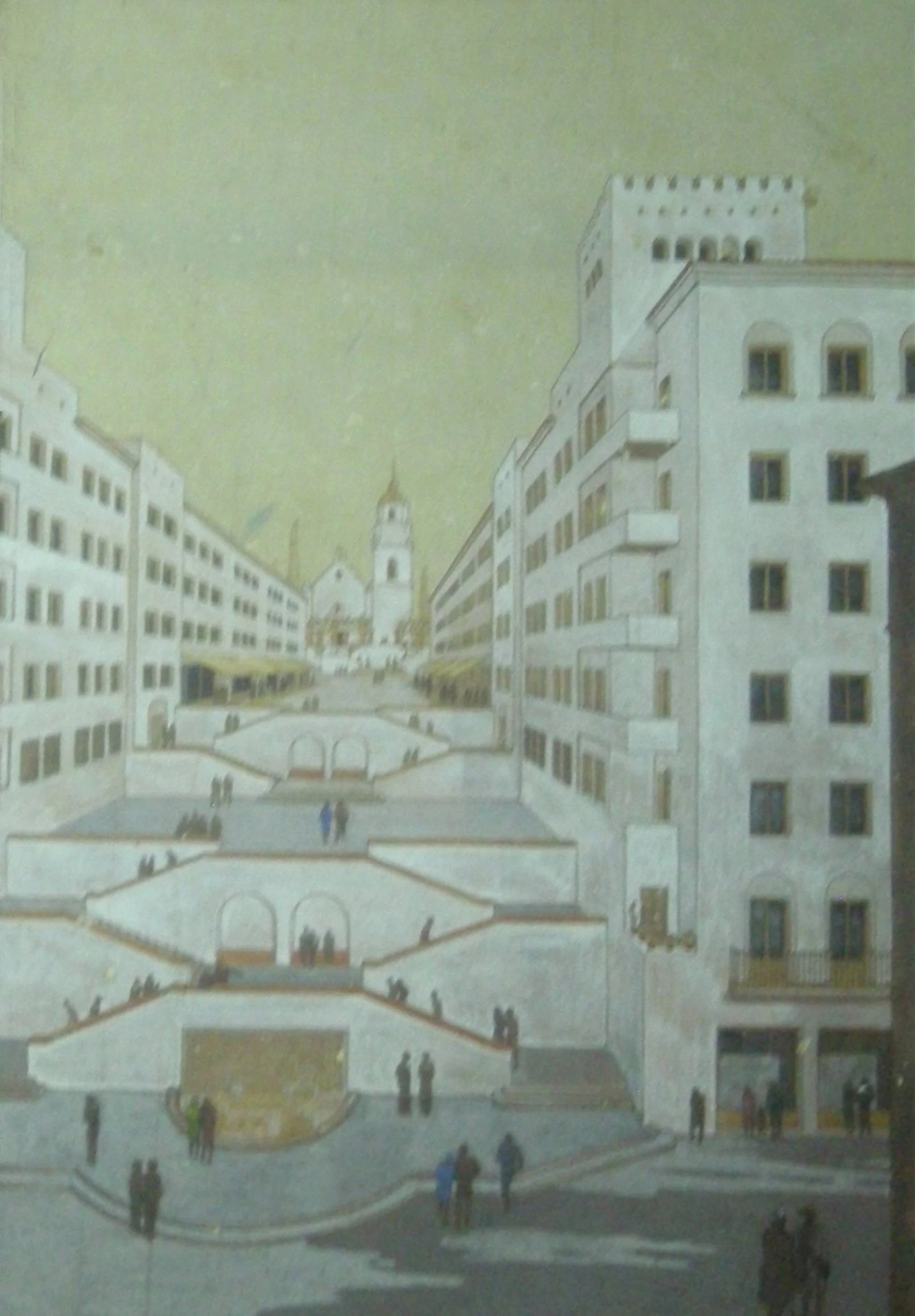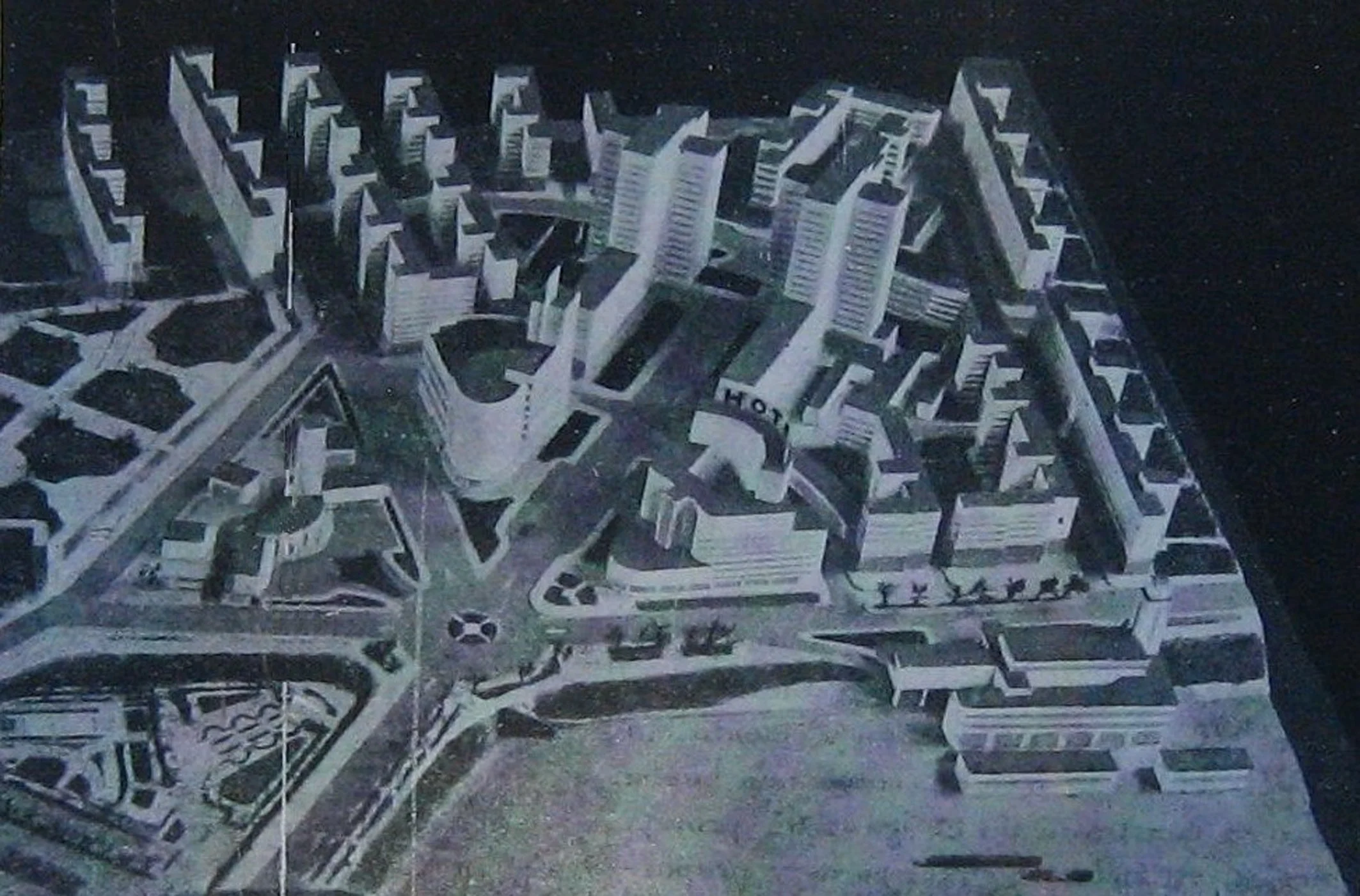 Grupo de edificaciones en el terreno ganado al mar. Perspectiva de la propuesta de César Cort para el concurso de Ceuta de 1930.