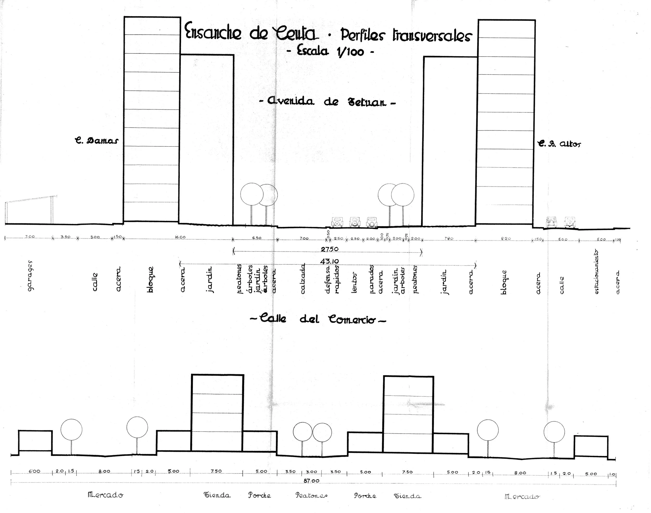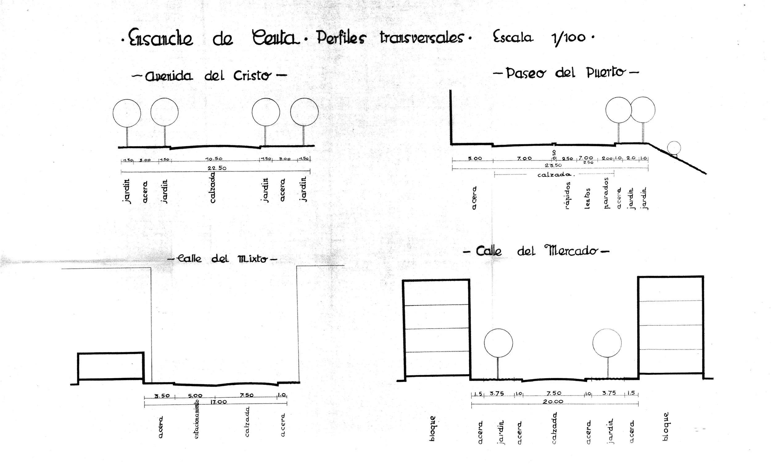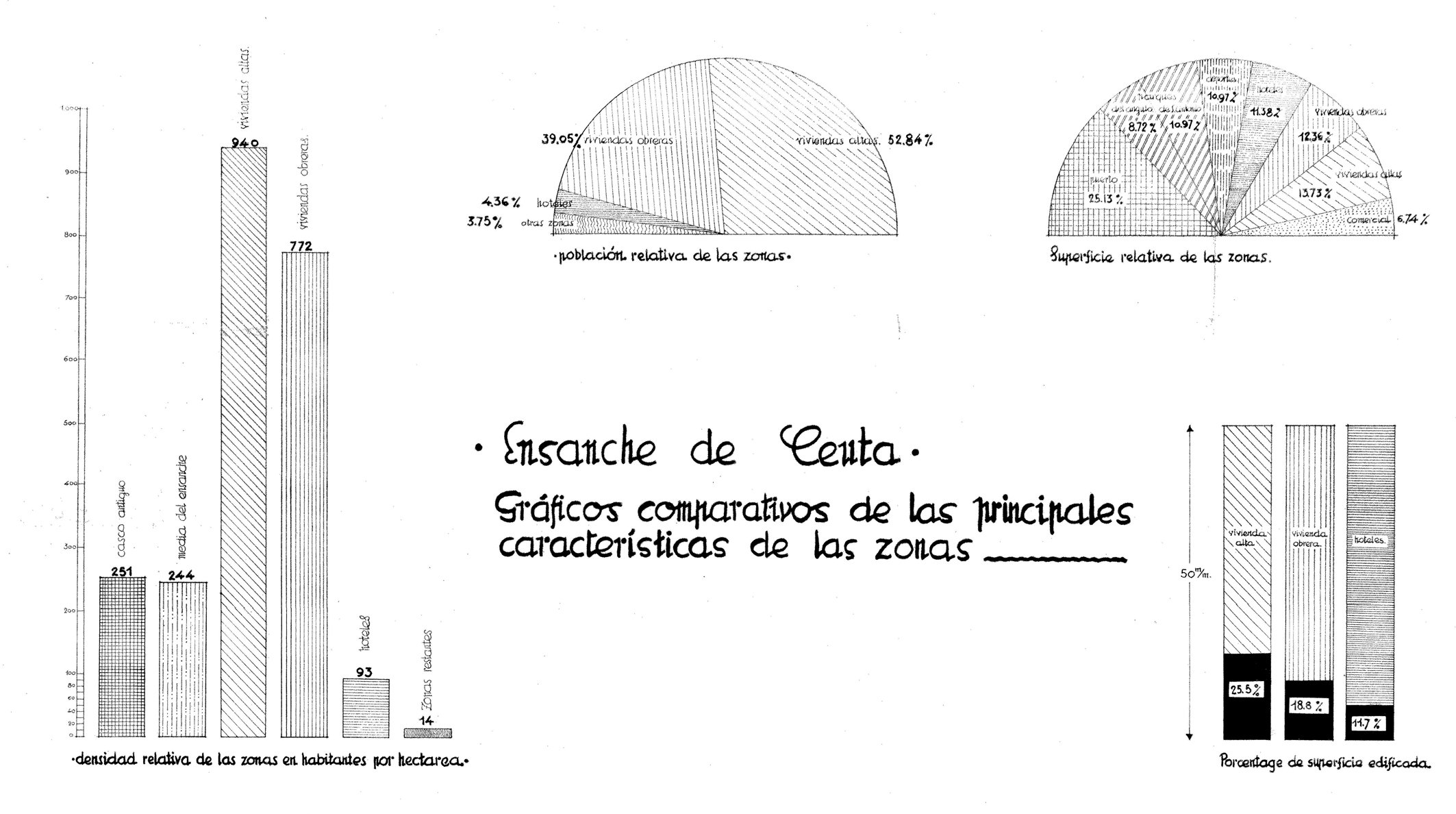 La simple relación de los planos y los documentos del proyecto de reforma y ensanche de Ceuta⁷⁹ presentados por los tres finalistas da idea del volumen de trabajo realizado. La parte gráfica comprendía perspectivas de los espacios urbanos más representativos, maquetas y planos generales y parciales de parques y jardines, del sistema viario, de los usos del suelo y de la edificación, y de las instalaciones, a los que se sumaban las memorias, los presupuestos y unas ordenanzas municipales.