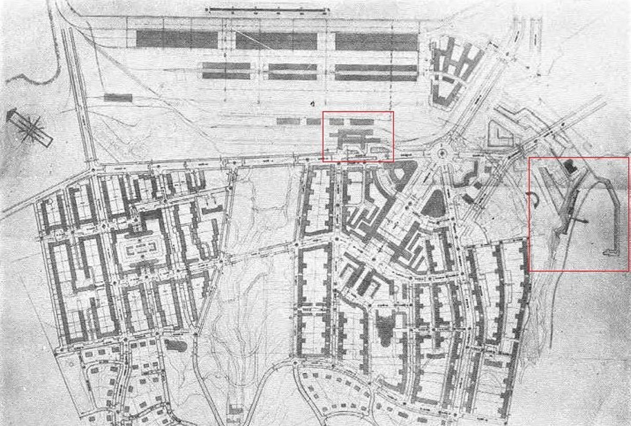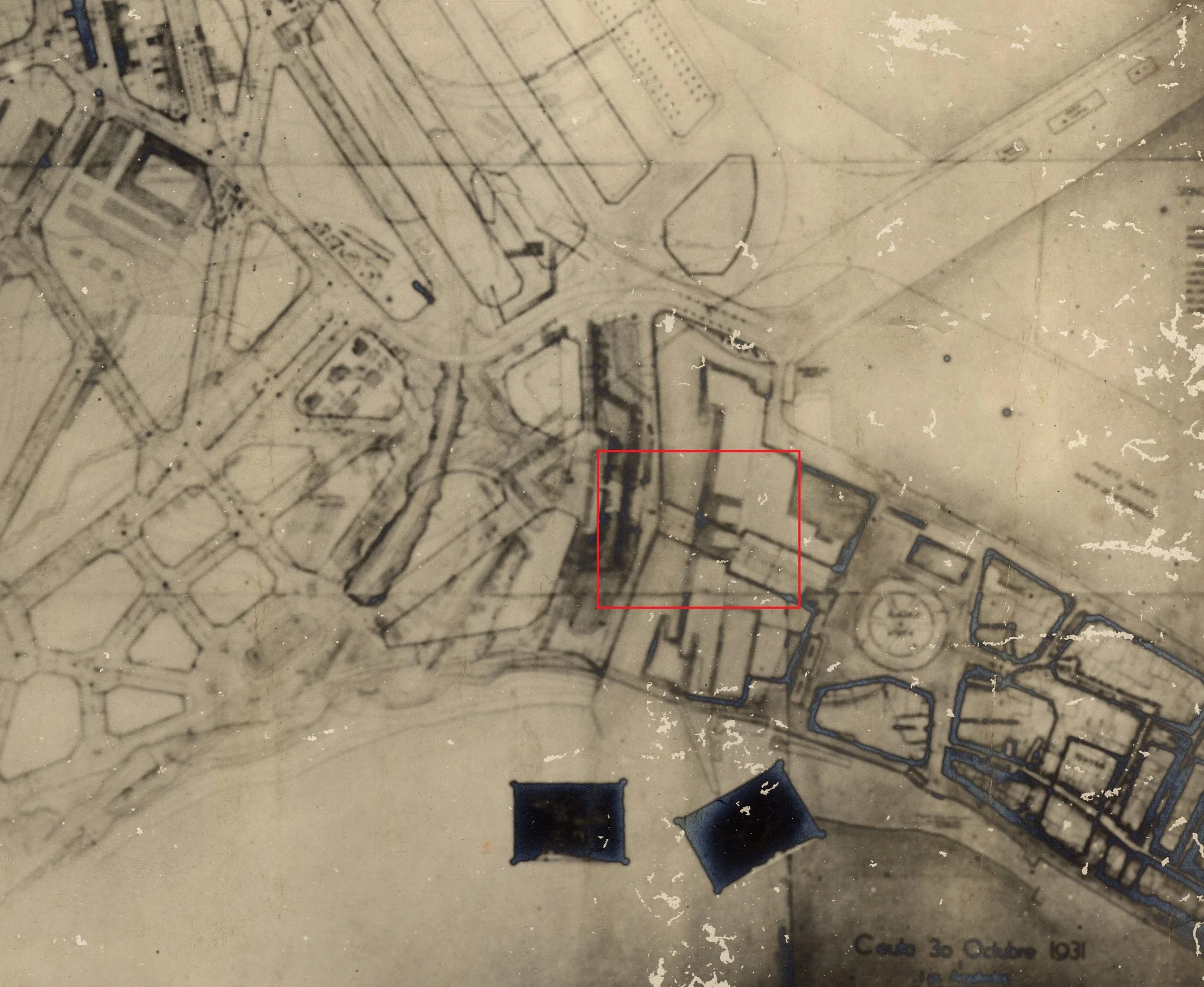 Plano de ordenación general del proyecto de ensanche de Ceuta de Gaspar Blein, 1931, donde se señalan el conjunto principal de la zona del ensanche con la estación ferroviaria (izquierda) y la zona del puerto (derecha). Archivo General de Ceuta.