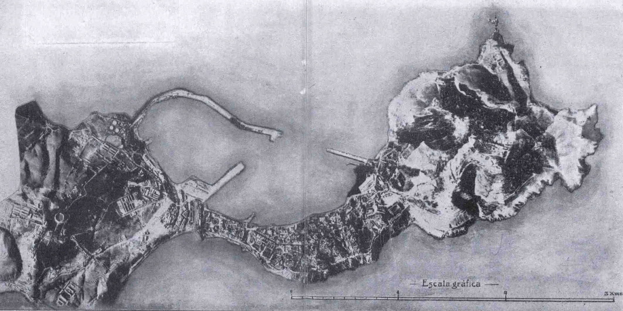 Fotografía aérea de Ceuta, donde se da cuenta de su condición de ciudad portuaria y de su topografía. La zona situada a la izquierda del istmo, el Campo Exterior, es donde estaba previsto llevarse a cabo el proyecto de ensanche de la ciudad según los concursos de 1930 y 1932.