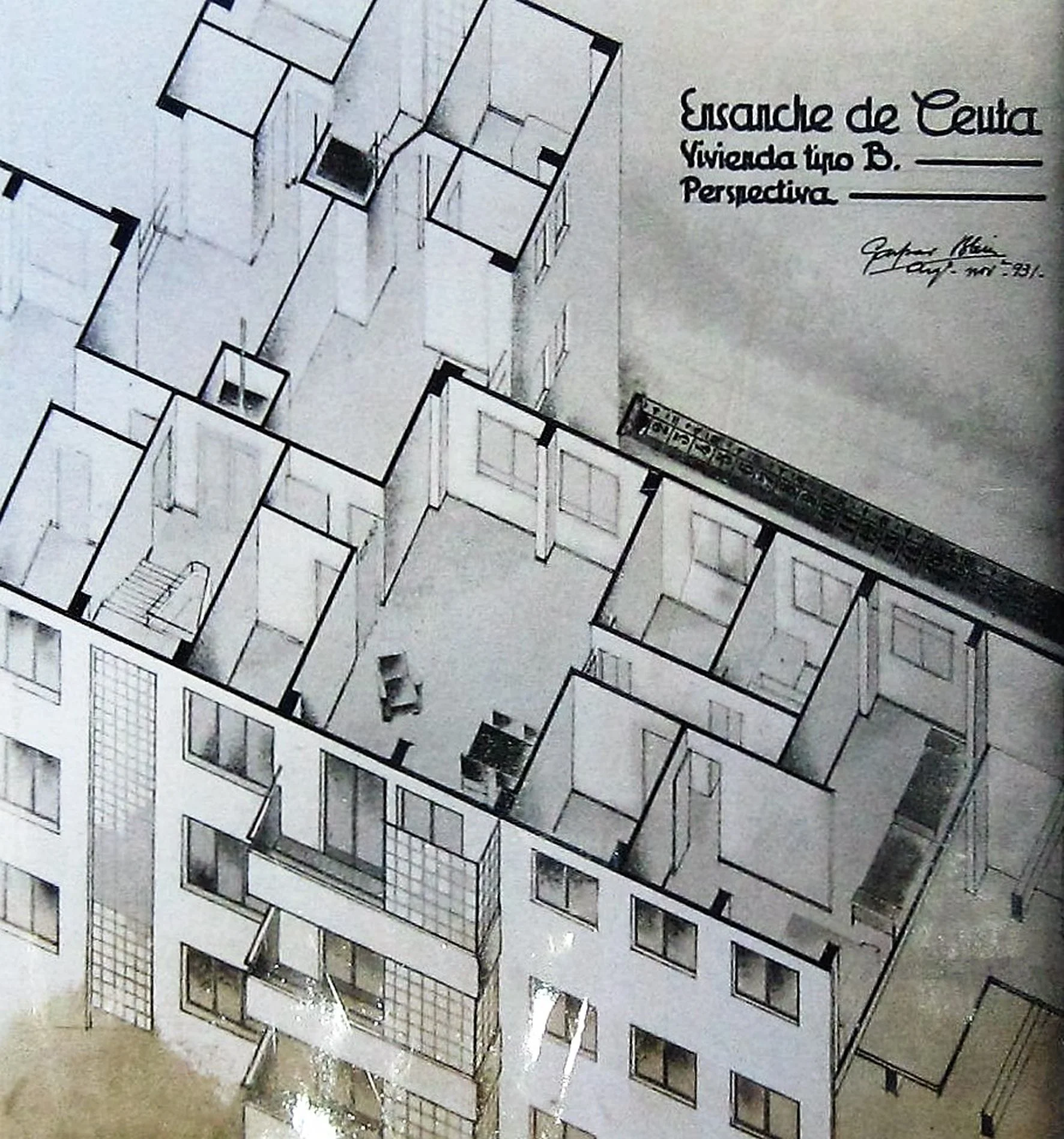 Desde 1926 el arquitecto Gaspar Blein Zarazaga (1902-1988)⁸⁶ venía ocupando la plaza de arquitecto segundo jefe de la Oficina Técnica de Obras de Ceuta, bajo la dirección del también arquitecto Santiago Sanguinetti (1875-1930)⁸⁷. Permaneció tres años en el cargo hasta que en 1929 pasó a desempeñar el cargo de arquitecto municipal de Murcia, con la tarea de dar continuidad al proyecto de extensión realizado por César Cort en 1926 que entonces se encontraba paralizado. En 1933 se incorporó a la Oficina Técnica del Ayuntamiento de Madrid, donde asumió con el paso del tiempo distintos cargos de responsabilidad hasta su jubilación. La vacante que dejó en Ceuta fue ocupada, tras superar el correspondiente concurso público, por su hermano José Blein, que desde 1927 colaboraba con él en el estudio de arquitectura que mantenía abierto en Ceuta. En Ceuta permaneció en el cargo hasta 1943. De hecho, José Blein asumió el cargo de arquitecto jefe de la Oficina Técnica de Obras de Ceuta a la muerte de Sanguinetti.