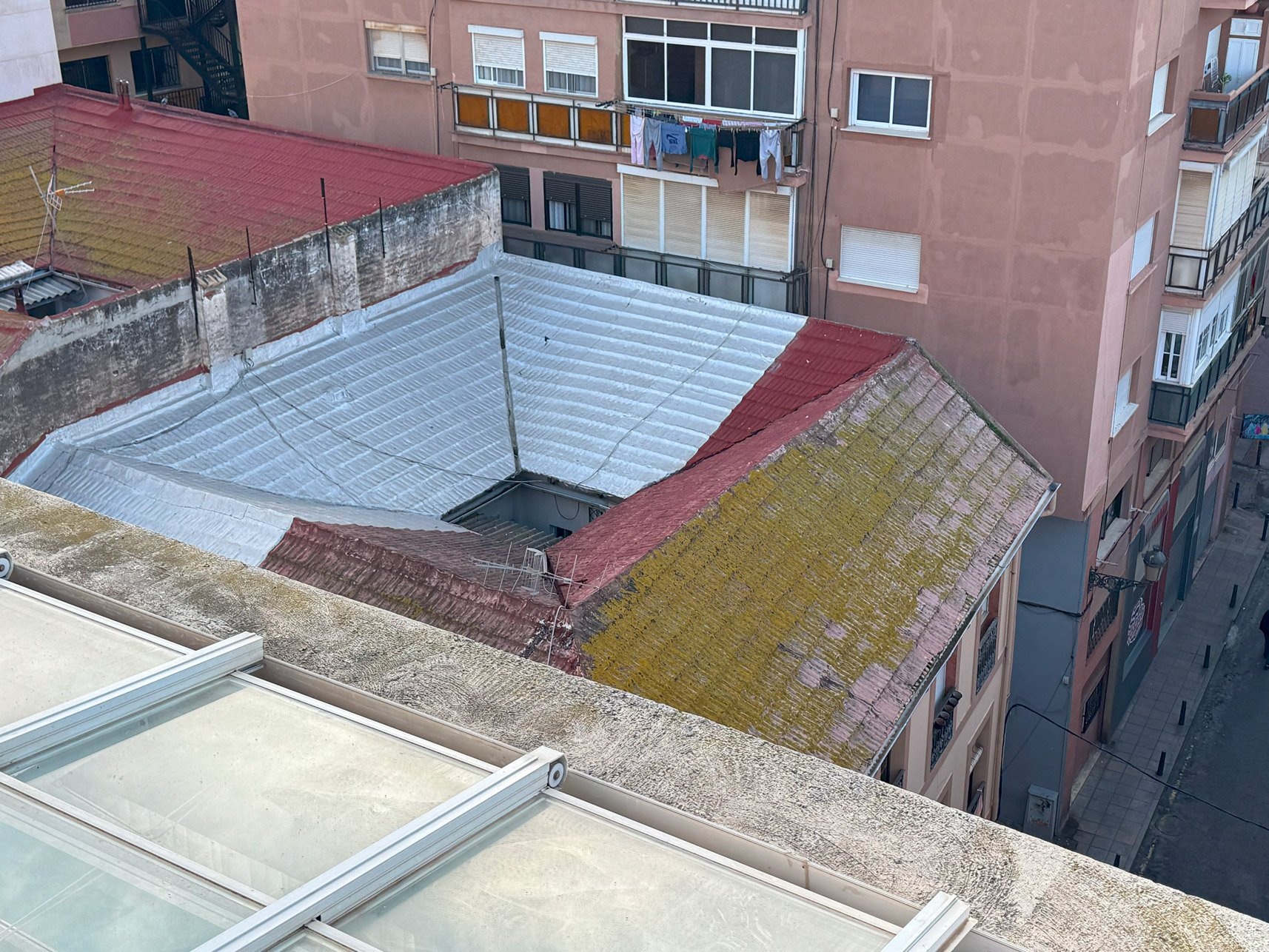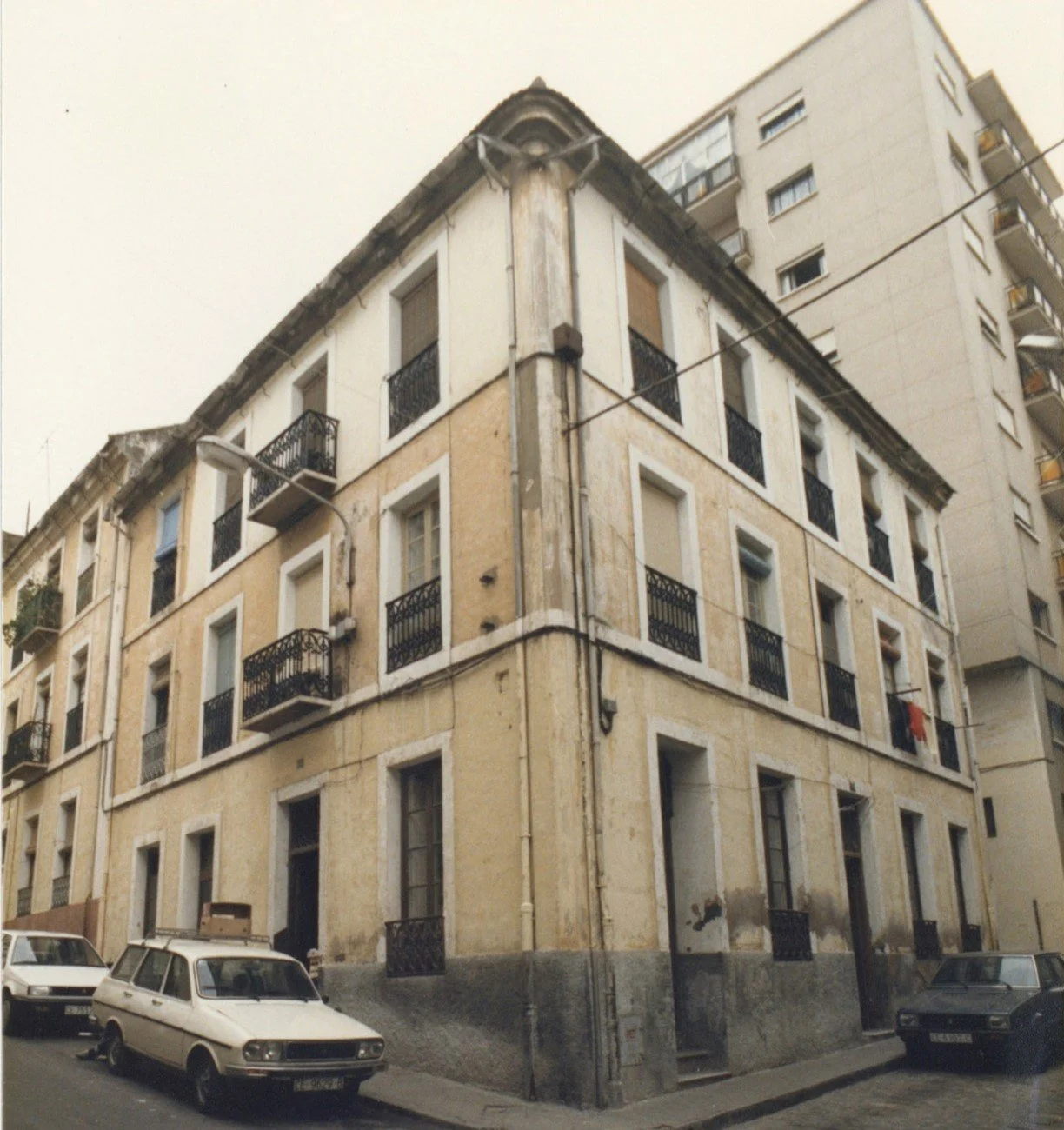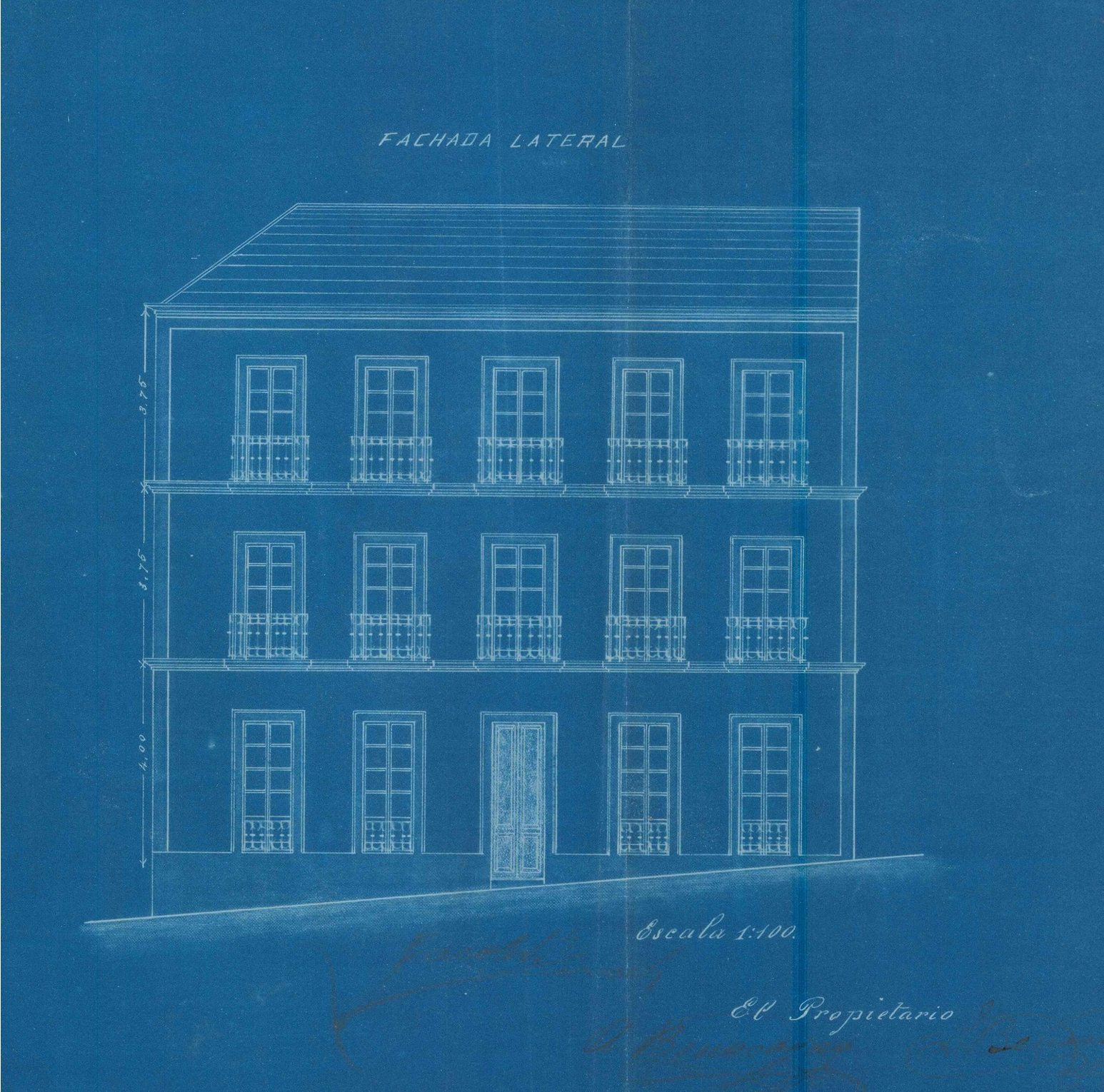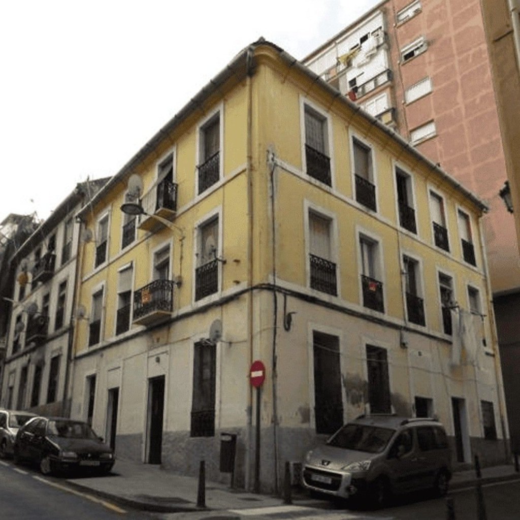 Estructura: Edificio en esquina entre medianeras de tres plantas formando manzana.