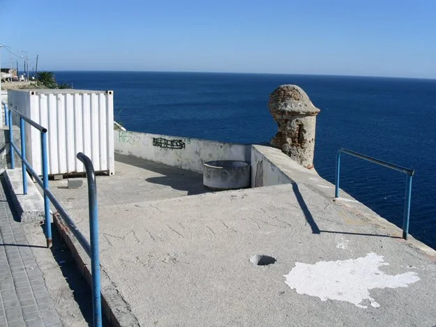 El elemento conservado principal del conjunto es sin duda su garita. Está constituida por cuatro cuerpos principales, de abajo a arriba, al plinto, el alambor, la linterna o cuerpo habitable, y la cúpula semiesférica. Tiene esta garita la particularidad de apoyarse en el terreno, al contrario de lo que suele ser habitual en el resto de casos, que se apoyan en ménsulas o cul–de-lampe. Esto es así por la presencia del alto escarpado que hace innecesaria la construcción de muros altos. El alambor es de un gran tamaño y posee mucho más cuerpo hacia el mar que hacia los flancos o laterales, ya que tiene que adaptarse a las irregularidades del terreno. La linterna es cilíndrica y conserva dos de las tres aspilleras que tenía. Corona el monumento la cúpula, con su cornisón.