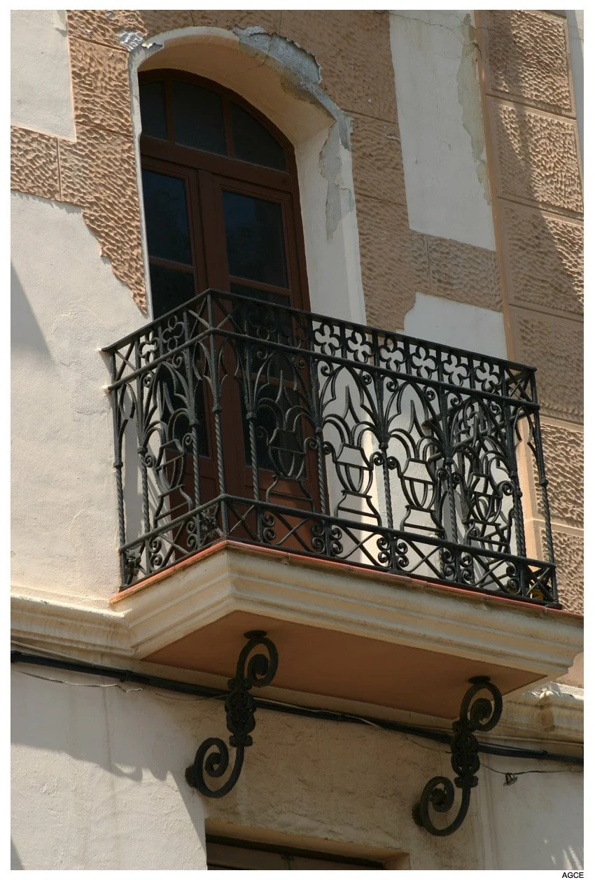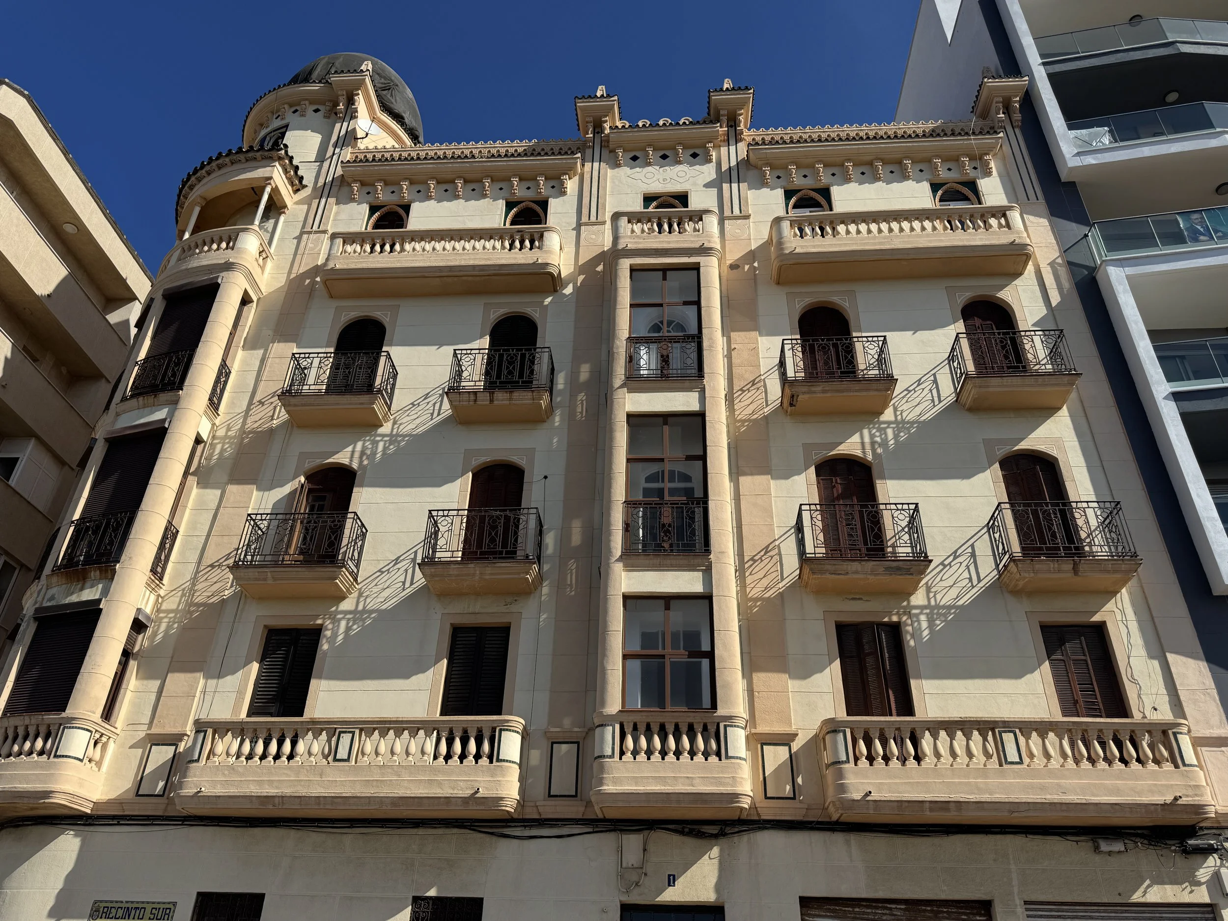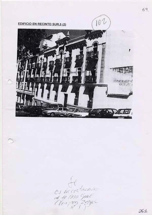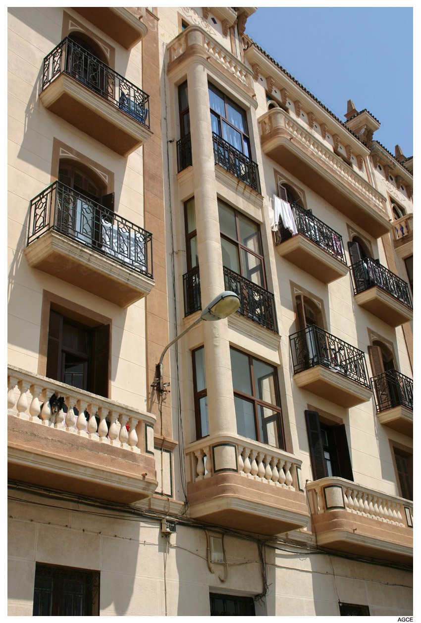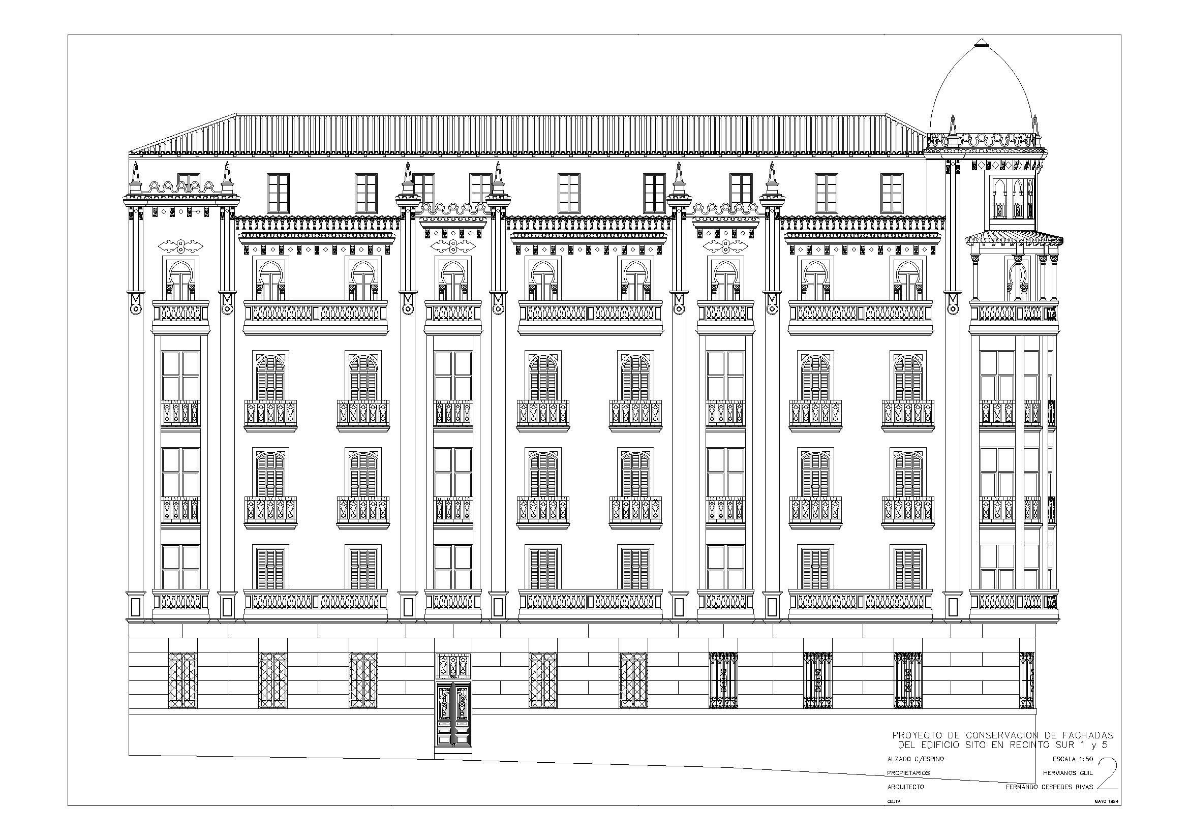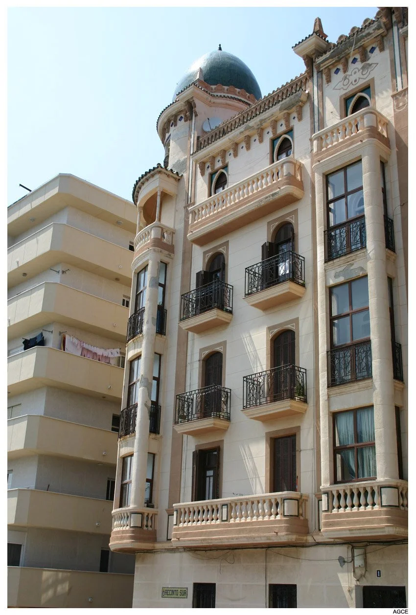 Levantado durante la II República y Guerra Civil y finalizado en 1938, en su factura se ve el diseño de los Blein, más concretamente de José. Sus dos fachadas, al Recinto Sur y Espino, salvan un considerable desnivel que hacen entreplanta de los bajos, sobre los que suceden otras cuatro plantas. La fachada presenta tres volúmenes volados, el mayor de los cuales, formando rotonda cubre la esquina, que se transforma en balcón con columnas en la última planta, mirador que se descuella entre las azoteas para sostener una cúpula de teja vidriada. El resto del edificio se remata con tejadillos vidriados y pináculos. En los planos se combinan balaustradas de obra y balcones de forma, con modificaciones en los vanos relacionados con el orden de las plantas. También es original el portón y la caja de escalera, con interesantes baldosines y azulejos. (J. L. Gómez Barceló, 1992. Ceuta Cultural). Obras de conservación de fachadas ejecutadas según proyecto redactado por el arquitecto Fernando Céspedes Rivas en 1994 (AGC, expediente número 76002).