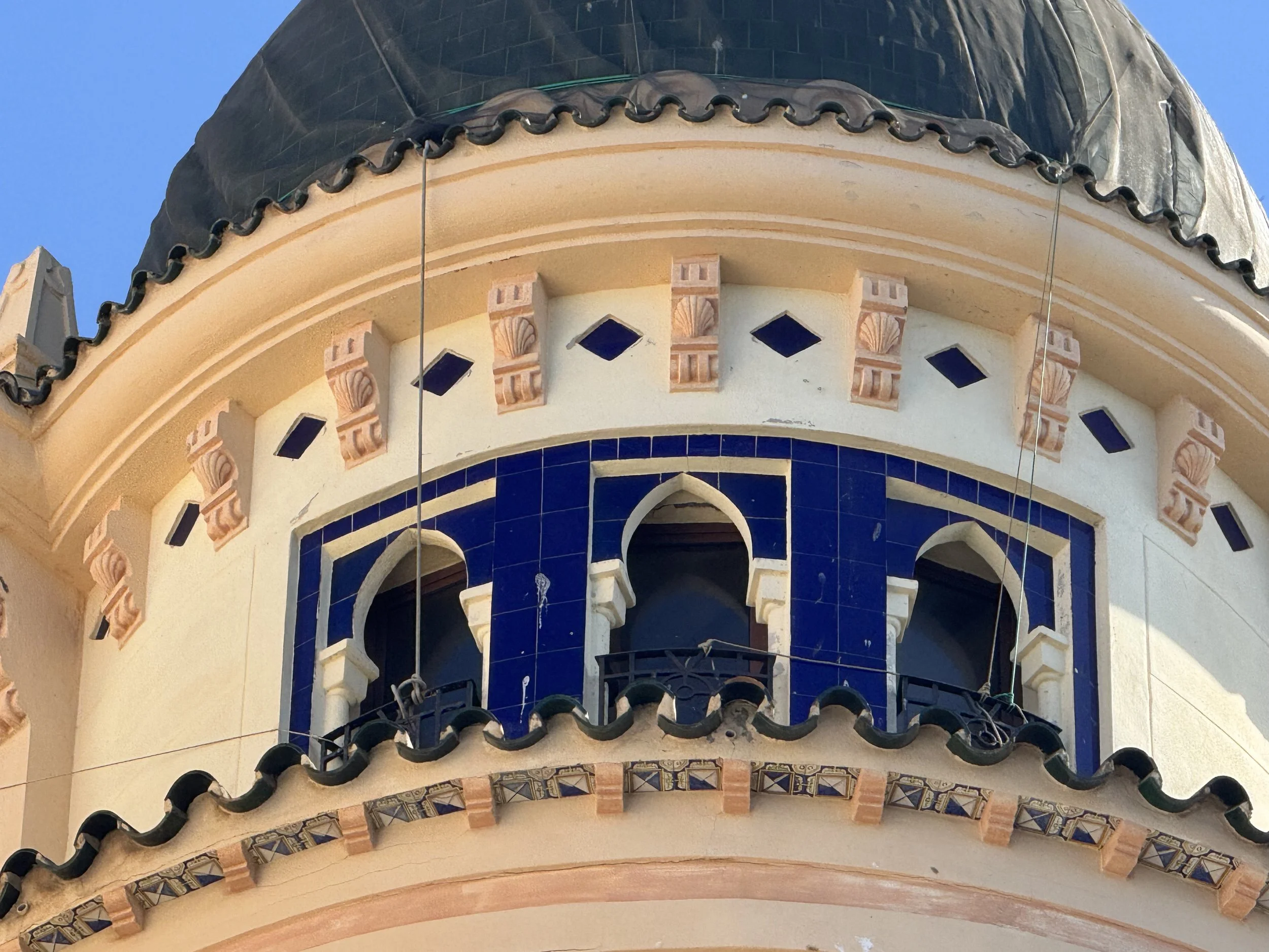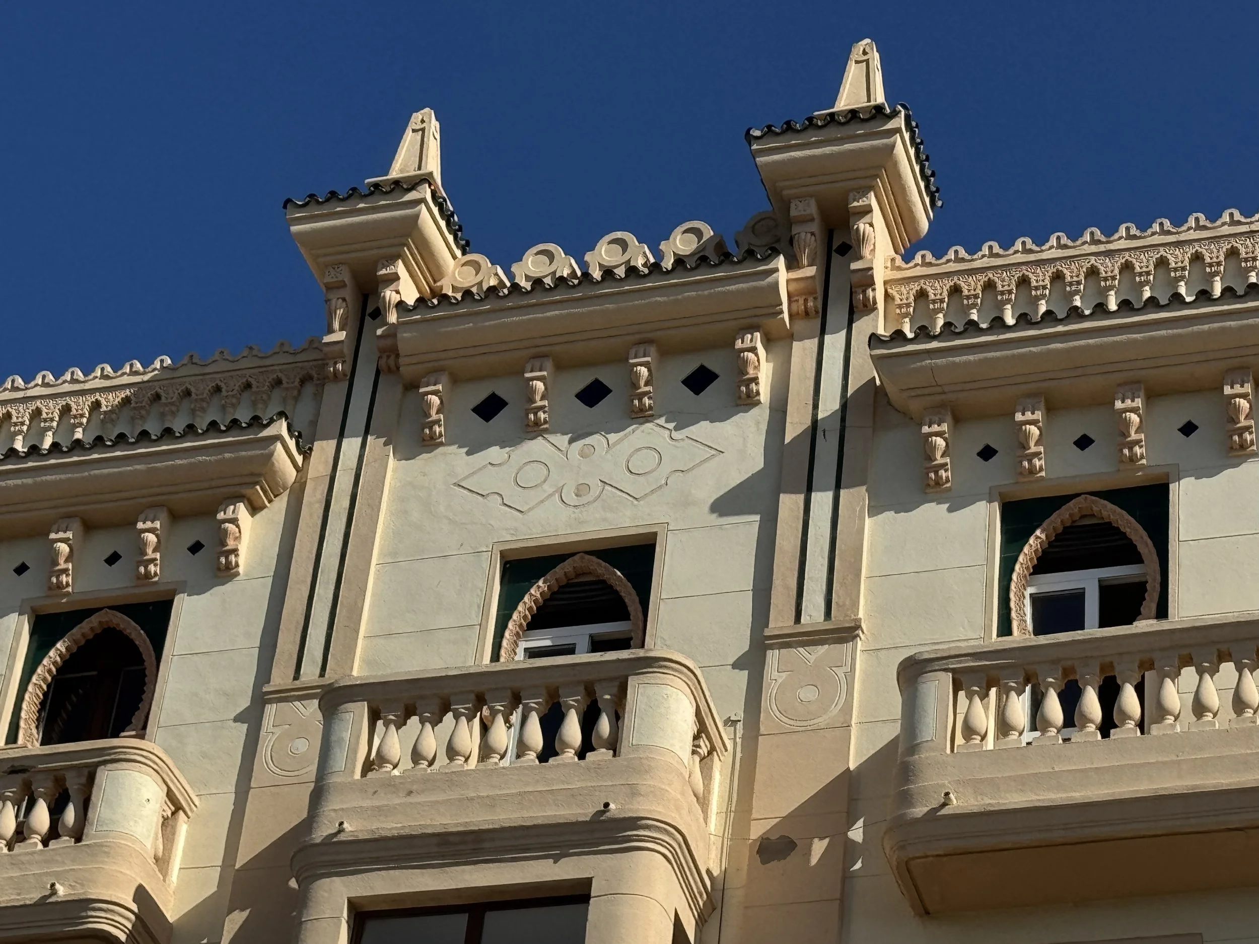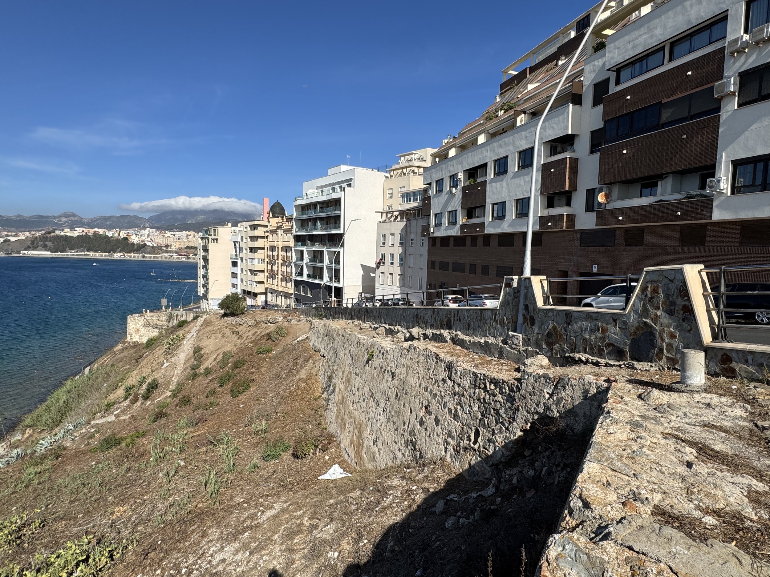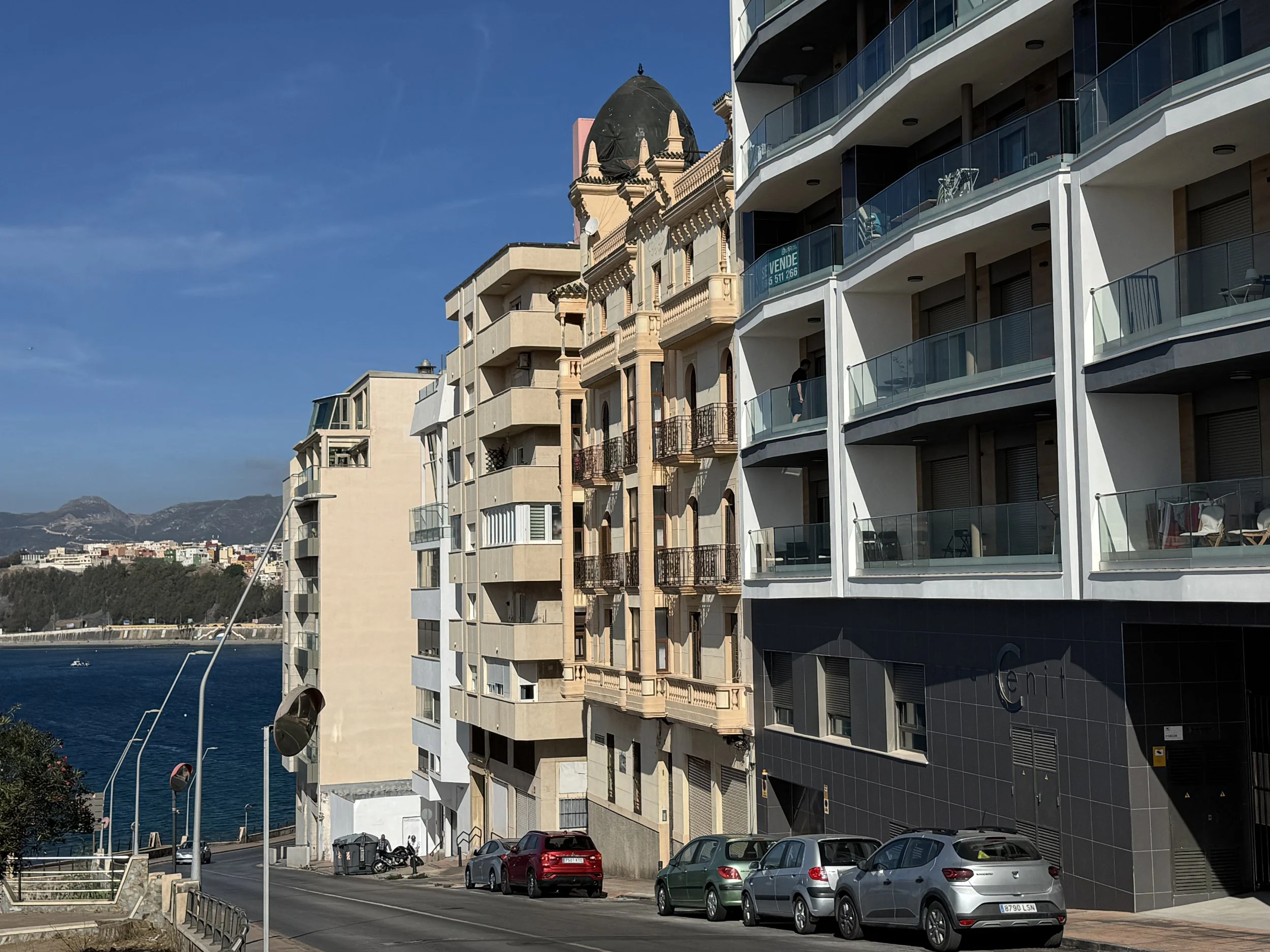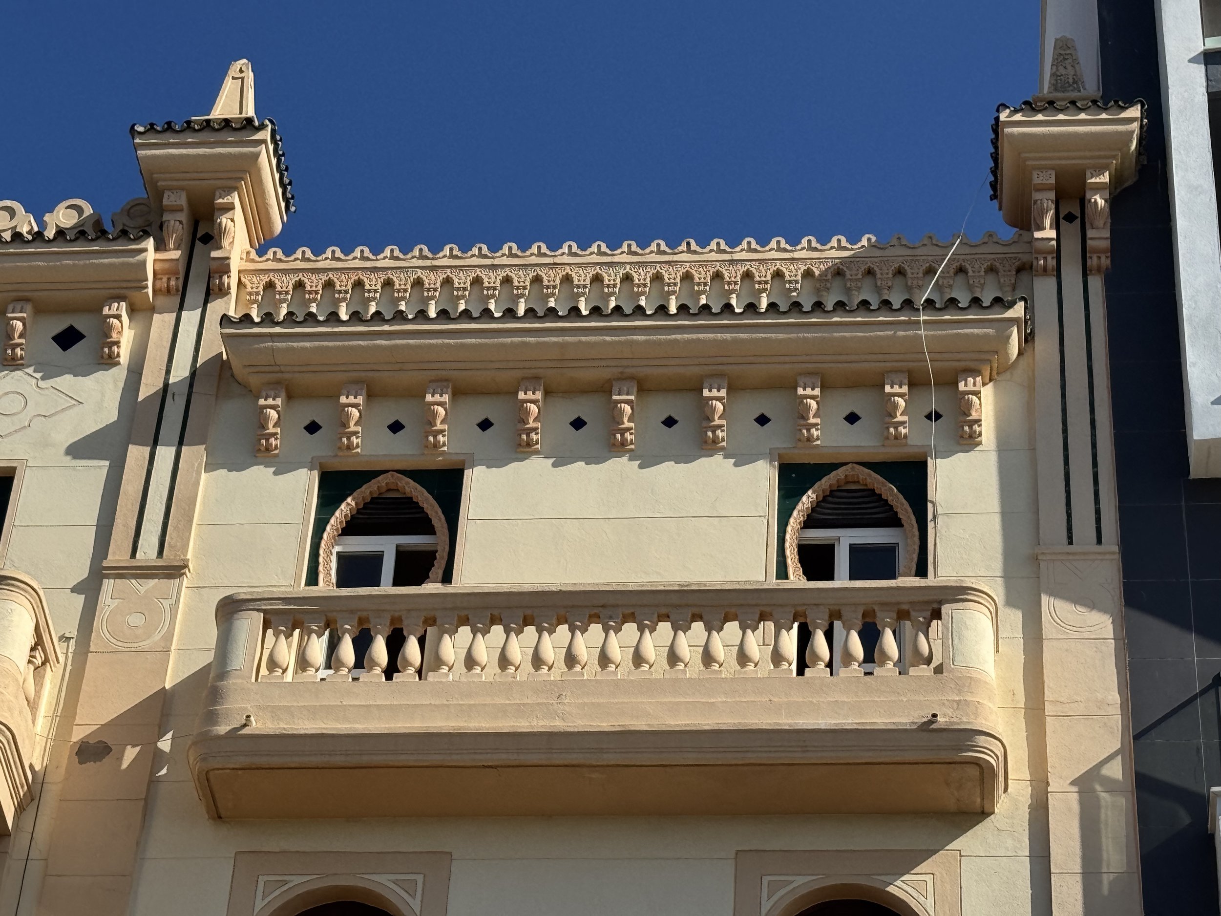 Levantado durante la II República y Guerra Civil y finalizado en 1938, en su factura se ve el diseño de los Blein, más concretamente de José. Sus dos fachadas, al Recinto Sur y Espino, salvan un considerable desnivel que hacen entreplanta de los bajos, sobre los que suceden otras cuatro plantas. La fachada presenta tres volúmenes volados, el mayor de los cuales, formando rotonda cubre la esquina, que se transforma en balcón con columnas en la última planta, mirador que se descuella entre las azoteas para sostener una cúpula de teja vidriada. El resto del edificio se remata con tejadillos vidriados y pináculos. En los planos se combinan balaustradas de obra y balcones de forma, con modificaciones en los vanos relacionados con el orden de las plantas. También es original el portón y la caja de escalera, con interesantes baldosines y azulejos. (J. L. Gómez Barceló, 1992. Ceuta Cultural). Obras de conservación de fachadas ejecutadas según proyecto redactado por el arquitecto Fernando Céspedes Rivas en 1994 (AGC, expediente número 76002).