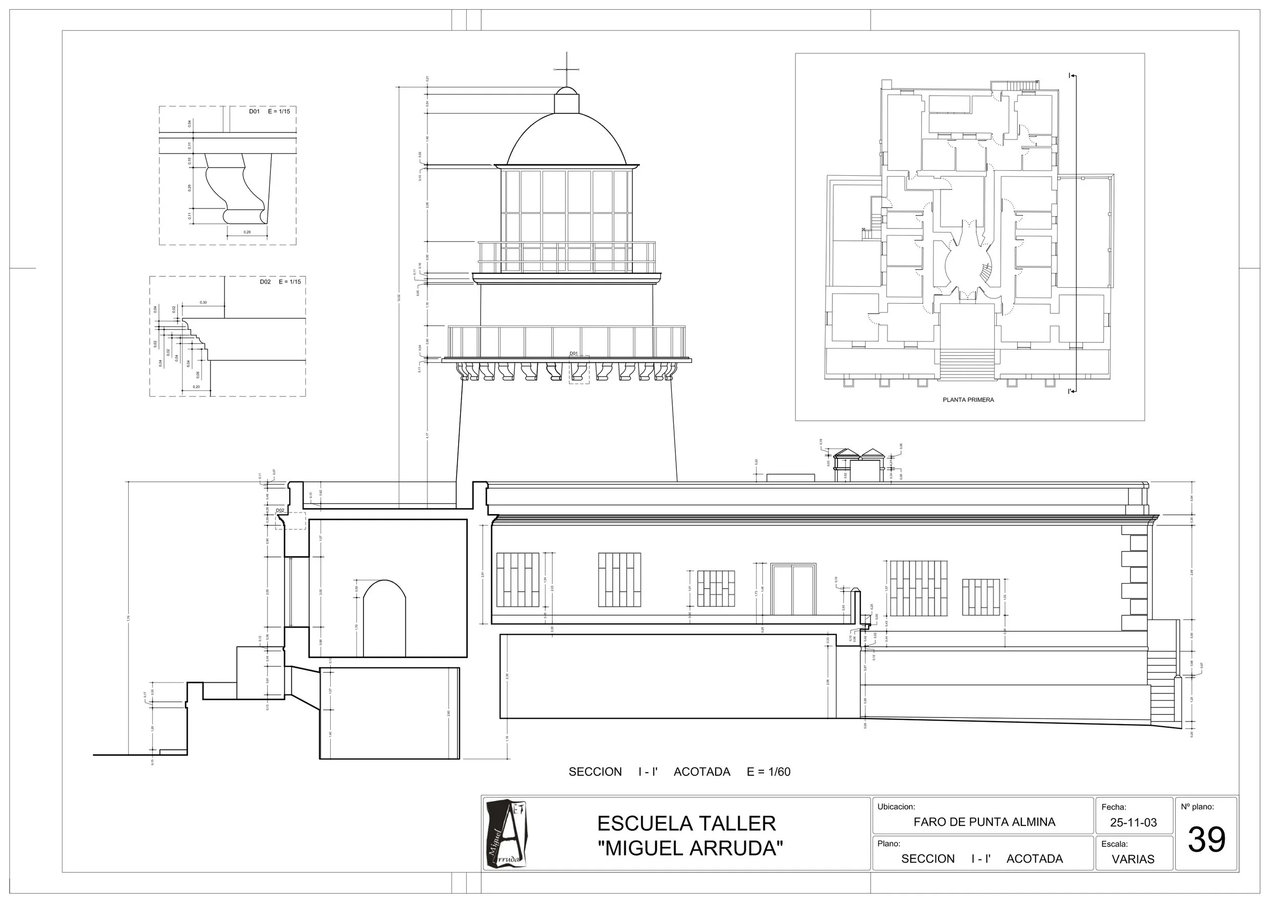 El edificio, de fabrica, sólida y elegante, de planta cuadrada de 60 pies cada lado, consta de dos cuerpos laterales (ampliados con posterioridad en? ) Y uno central, a la entrada del vestíbulo existe una escalinata de once peldaños y del eje que pasa por el centro del edificio arranca una torre, cuyo diámetro es de 15 pies. El vestíbulo tiene a derecha e izquierda pabellones para vivienda de los empleados, almacén y deposito de repuestos para el servicio.