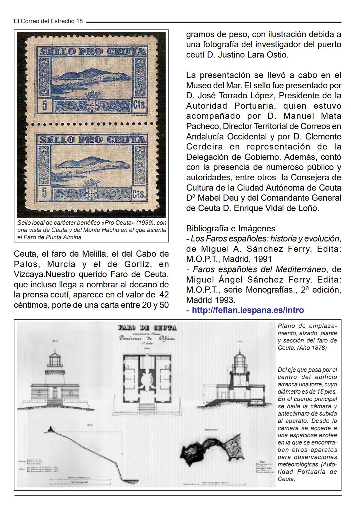 A cargo de la jefatura de Obras Publicas de Ceuta están el Faro de primer orden de Ceuta y la sirena de Punta Almina. El primero esta situado en el monte Hacho a 148 metros sobre el nivel del mar, con alcance de 38 millas y apariencia de un grupo de dos relámpagos blancos cada diez segundos.