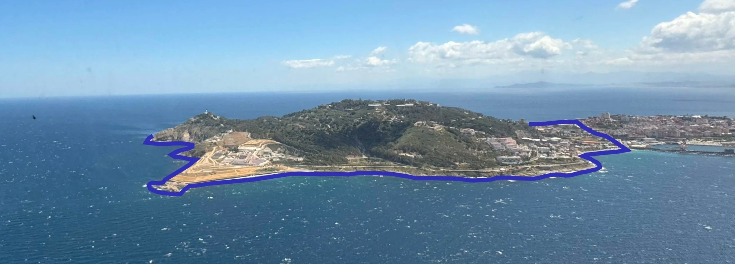 Villada e Hita identifican el topónimo Yabal al-Mina con el Monte Hacho y sus estribaciones hasta la actual Cortadura del Valle. Sería una zona ocupada tanto por tierras comunales, dedicadas a la recogida de leña, el pastoreo del ganado, y la recogida de frutos silvestres, como por algunas propiedades privadas. Éstas habían de conformar un hábitat disperso a base de residencias y de pequeñas parcelas cultivadas. Las fuentes escritas y arqueológicas y los trabajos de Carlos Gozalbes Cravioto sobre el urbanismo de la ciudad señalan que en el perímetro urbano se ubicaban algunos de los cementerios de la ciudad. En la zona del Hacho, a mediados del siglo XII, habría tres cementerios: el de al-Tuta, el más antiguo, en la falda este del Hacho; el de al-Manara, situado en el entorno de la actual Ermita de San Antonio; finalmente, el Cementerio Mayor o al-Kubra, en la parte occidental del Hacho⁷. Todo este conjunto contaba con una muralla litoral, al menos en la costa norte desde San Amaro hacia Santa Catalina, ya que la sur presenta menor accesibilidad. Rehabilitada por Yusuf ibn Tasufin, que encargó las tareas al cadí Ibn Ahmad hacia 1128-1129, presentó siempre especial vulnerabilidad, quizás por su carácter periurbano, como ocurriera en la muralla litoral gibraltareña meriní que discurría desde la Turba hasta Punta Europa.