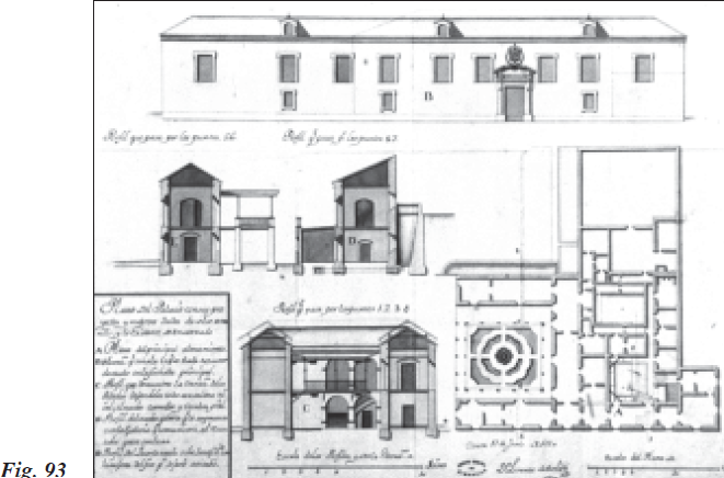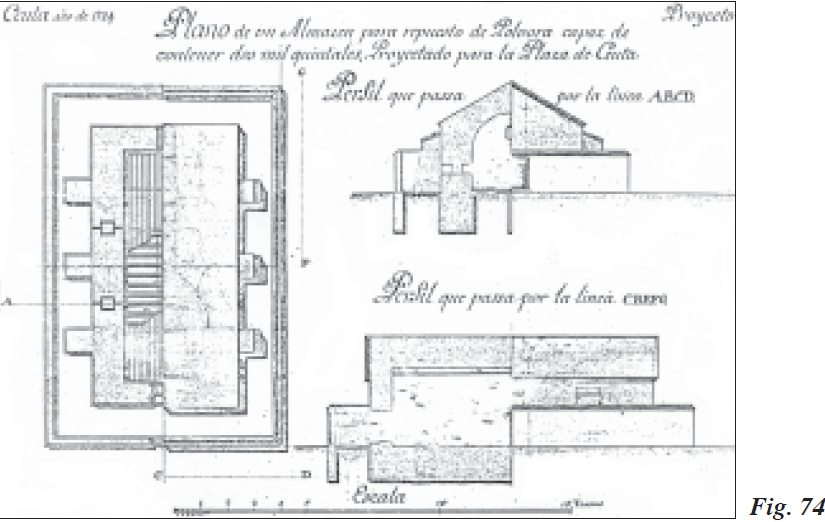 Antes de marchar a la Península, el Ingeniero General debió realizar el plano y perfiles de un almacén de pólvora que se establecería en la Plaza de África, próximo a los nuevos cuarteles proyectados junto a la Muralla Real y a la Maestranza de Artillería (Fig. 74). Su capacidad rondaría los 2000 quintales de pólvora, y estaría construido con bóvedas a prueba de bomba, como todos los que se levantaron desde el sitio de Muley Ismail.