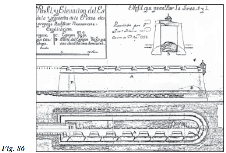 “...pues en la actualidad no quedaba descubierta de ningún fuego y el pequeño flanquillo formaba un ángulo muerto, lo cual es sumamente defectuoso en la Fortificación, pues si el enemigo venía a apoderarse del ángulo saliente del camino cubierto de este Baluarte, podría sin la menor dificultad atacar el Minador en la cara derecha, sin ser ofendido de ninguna parte”.