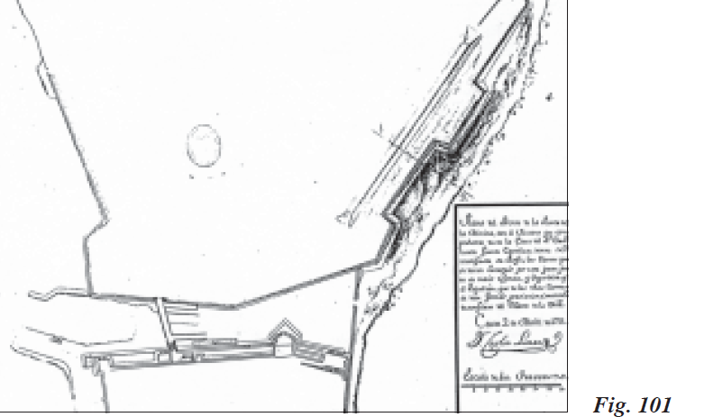 De la misma fecha fue otro plano suyo (Fig. 101) del Frente de la Puerta de la Almina, que representaba toda la superficie comprendida entre la Casa del Gobernador y Fuente Caballos. En este último paraje se perfilaban las tierras que se deberían escarpar para su mejor defensa y seguridad, así como el espaldón u obra que en dichas fortificaciones se debería fabricar de modo provisional para que quedase todo desenfilado de la batería enemiga situada en el Morro de la Viña.