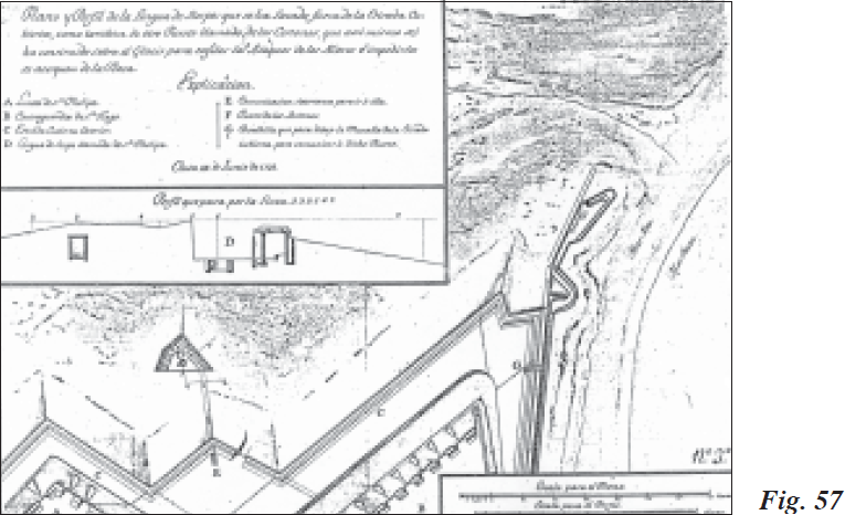 Hemos localizado planos y perfiles, fechados a finales de junio y diciembre de 1723, relativos a obras internas y externas de fortificación y proyectos para mejorarlas que fueron dirigidos por el Ingeniero General. En primer lugar planificó la Lengua de Sierpe del Puesto de la Tenaza o de los Cestones, con su caponera cubierta y entendiéndola como obra adelantada a la Contraguardia de Santiago, de lado del Mar de España o de Poniente (Figs. 57 y 58). La Luneta de San Jorge, así nombrada en honor al santo del Ingeniero General, estaba situada sobre el Barranco del Chorrillo, con una altura desde el pie de la muralla hasta el Mar de Tetuán o de Levante de dieciséis toesas, como obra adelantada que enfilara los ataques enemigos y que les impidiera su acercamiento. Contaba con bóveda para poner la gente a cubierto y un almacén para pólvora y granadas (Fig. 59).