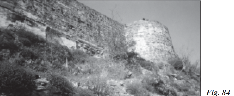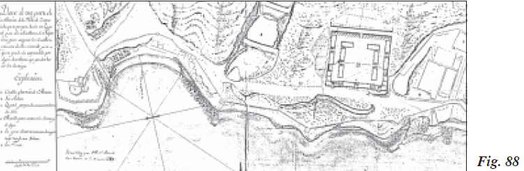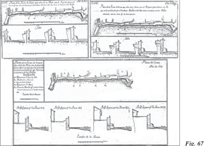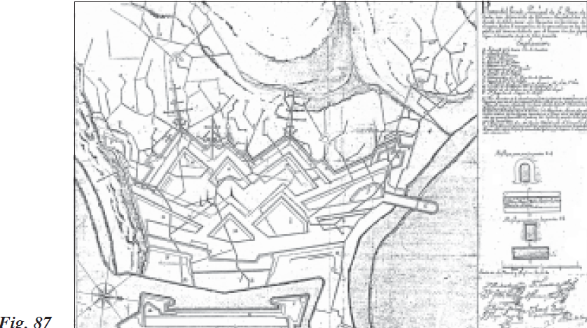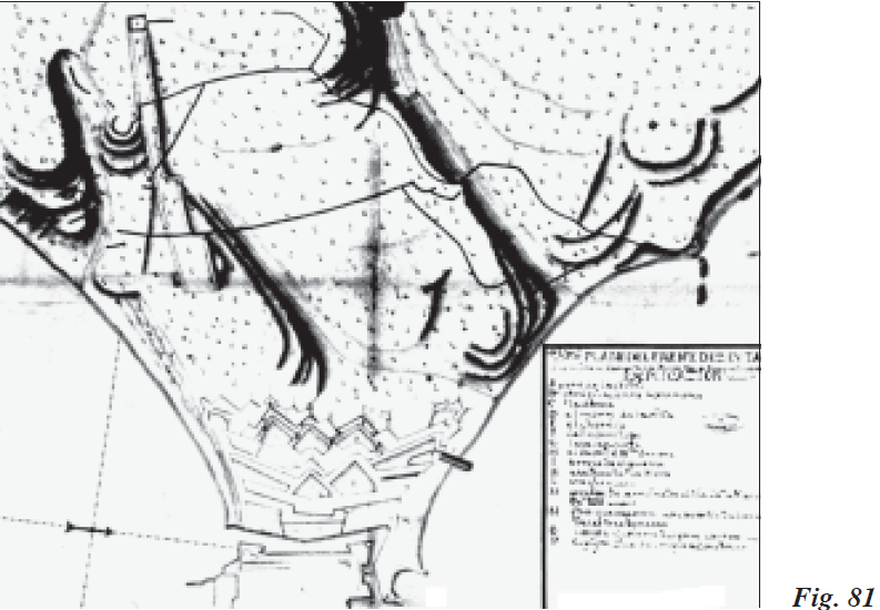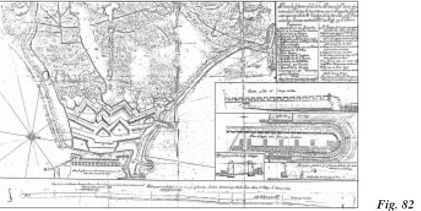 Los esfuerzos por seguir perfeccionando en la plaza las líneas más avanzadas fueron constantes en estos años posteriores a la finalización del sitio, con especial dedicación sobre todo en las posiciones que corrían paralelas a ambas bandas costeras norte y sur. En esta última el ingeniero Llamas trazó plano y perfiles del Fuerte de San Jorge, tal y como se encontraba a primeros de 1729, señalando los momentos de bajamar y pleamar y su altura sobre el nivel del mar, los distintos puestos avanzados que guarnecían los granaderos, el cuarto del capitán de granaderos, los refugios de tablas para subalternos y granaderos, así como el estado ruinoso de parte de su estacada. En plano y perfiles de mediados de julio, proyectó Llamas en dicho fuerte o luneta (Fig. 78) un proyecto con el adelantamiento de su estacada y estrada cubierta, detallando cómo el cuarto para los capitanes granaderos hacía frente al foso y detenía el terraplén de la estrada cubierta. Igualmente situó una muralla nueva, así como otra vía de salida hacia el campo enemigo que estaba bien protegida del tiro enfilado.