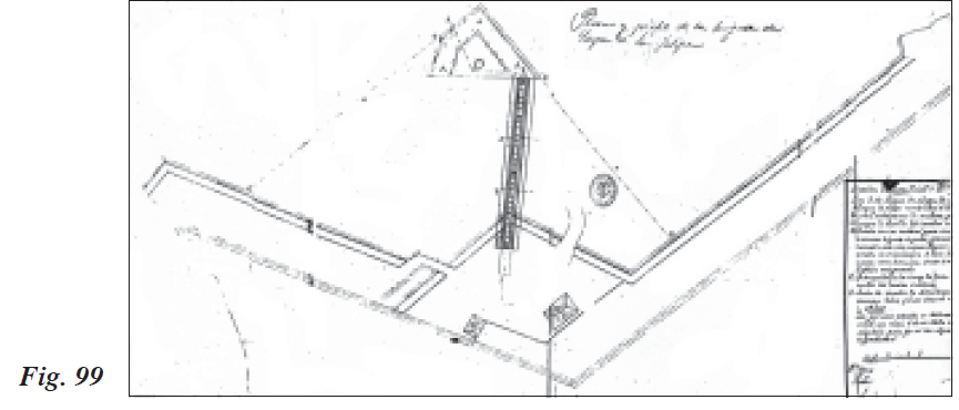 Siguiendo con el plan iniciado por su Ingeniero Ayudante, Amici hizo a mediados de diciembre una relación y un plano (Fig. 107) que indicaban el estado en que se encontraba el Foso de la Almina, centrándose en la parte destinada a resguardar las barcazas que descargaban materiales y víveres procedentes de la Península para las reales obras de la plaza de Ceuta, a cuyo mismo fin estaban destinados los buques de remo de pequeño porte, como el nuevo javeque, la lancha real y la liparota. En el plano indicaba el estado del referido foso antes del mes de septiembre, cuando el gobernador local comenzó a profundizar su base, hallando un nivel de dos pies de profundidad durante la pleamar, dos pies de arena y después un suelo de pizarra continua. Estando las aguas en marea baja, dicha zona quedaba casi seca hasta el puente, y entonces por delante del andén o muelle se contaba con agua suficiente para arrimar las otras barcazas para descargarlas, actividad portuaria que se veía favorecida en invierno, debido a la existencia de mayores mareas. Por la parte del Baluarte de San Sebastián, llamado al presente el Revellín, la pizarra quedaba siempre al descubierto, sirviendo de estribo a la fundación de su muralla.