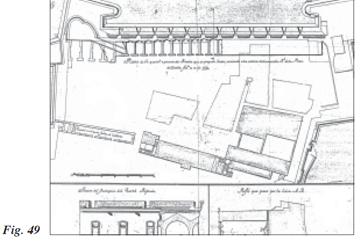 La actuación de los profesionales de la ingeniería militar seguía abarcando todos los ámbitos de la ciudad, y el factor de esta especial dedicación ingenieril fue la insistencia del sitio durante estos años. Con la fijación puesta en la toma de la plaza, los sitiadores acentuaron con virulencia los ataques artilleros, debiendo dichos profesionales de la defensa buscar nuevos abrigos, como los ya estudiados anteriormente, practicar demoliciones en los edificios que apenas se podían mantener en pie, e incluso reforzar aquéllos más endebles o expuestos al alcance enemigo. Tal fue el caso del Palacio Episcopal (Fig. 66), que modificó parte de su estructura interna para dichos fines. En esta residencia episcopal se mantuvieron el aposento principal y la escalera principal de acceso al mismo y resto de los aposentos de la segunda estancia. Se modificaba la puerta de acceso al aposento del Obispo y el corredor que comunicaba al resto de las dependencias, así como otra puerta que se debería abrir en éste para que los criados pudiesen entrar sin pasar por la habitación principal. Se cambiarían las paredes de los cuartos que habitaban algunos miembros eclesiásticos, los cuales pasarían para mayor comodidad a los cuartos bajos, y por último se dotaría de mayor espesor a la muralla que serviría de pie derecho de la escalera principal, para que de este modo el edificio estuviese más abrigado y consistente ante los cañonazos enemigos.