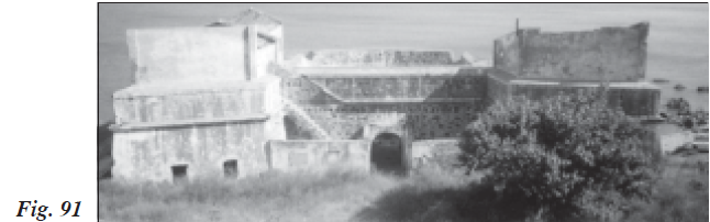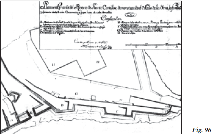 La Batería de Torremocha, a barbeta, tenía once cañones del calibre dieciocho y defendía los barcos de la plaza del corso en el Mar de Poniente o de Gibraltar. Impedía, en parte, el bombardeo marítimo sobre los almacenes de pólvora y desde ella se hacían, con el aviso dado por el cañón del Monte Hacho, las señales para que los navíos que usualmente proveían la plaza de Ceuta estuviesen atentos a cualquier ataque imprevisto. En el Castillo de San Amaro (Fig. 92) había cinco cañones del calibre doce para la defensa de pequeños desembarcaderos cercanos y la Bahía Norte, por lo que sería conveniente aumentar su número y su calibre. La Batería de San Pedro tenía tres cañones del calibre veinticuatro, habiendo sido proyectada que fuese perfeccionada en forma de porción de círculo y teniéndose la intención de incorporarle otros tres cañones del mismo calibre para defender mejor la Banda costera Norte. Por último, en el Hacho había un cañón del calibre nueve que servía para avisar a la Batería de Torremocha y que ésta obrase como hemos referido más arriba.