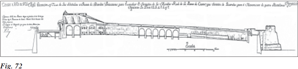 Verboom permaneció en la plaza de Ceuta hasta el 30 de abril de 1724 y el gobernador, Fernández de Ribadeo quiso continuar la obra de los cuarteles arrimados a la Muralla Real, los cuales habían sido iniciados por el Marqués de Villadarias. Mandó demoler algunas casas que realmente no estorbaban, pues estaban situadas a distancia de las nuevas obras, provocando un daño irreparable a sus humildes dueños que con frecuentes gastos y reparos las habían mantenido. Sobre este particular, el rey Felipe V, aprobó el proyecto para ensanchar el terraplén de la Muralla Real por medio de bóvedas a prueba de bomba que servirían de cuarteles (Figs. 71 y 72) para el alojamiento de cuatro batallones, según previno por carta el Marqués de Castelar el 24 de octubre de este año al gobernador local, dando fe el ingeniero Canelas de que el original estaba en la Dirección de Fortificaciones y con el visto bueno del Ingeniero Voluntario Agustín Ibáñez Garcés. Dicho proyecto cambió la ubicación del cubierto que había propuesto Jorge Próspero Verboom, a espaldas del Baluarte del Torreón para Maestranza de Artillería y Armería, debiéndose ahora demoler e instalarse en cuatro de las bóvedas nuevas con un patio cercado que se les podría añadir. Se mantendrían cuatro bóvedas antiguas que servirían de cuarteles y se añadirían dos espacios cubiertos nuevos para cocinas con sus fogones. El tejado de dichos cubiertos descansaría sobre una muralla que serviría al mismo tiempo de cerca para los cuarteles, y el acceso constaría de puertas accesorias y una puerta principal dotadas de sus correspondientes cuerpos de guardia. Se harían tres nuevas habitaciones, delante de las bóvedas antiguas, para cocinas y fogones, donde se deberían construir los pies derechos y arcos para formar el corredor y subir al segundo piso del acuartelamiento. Por último se levantaría otra habitación contigua a las rampas y cuarteles, que la cerrarían y circunvalarían por su lado opuesto. También, el subteniente e Ingeniero Extraordinario Miguel Sánchez Taramas trabajó en el mismo ensanche (Fig. 73), realizando también la correspondiente planimetría en la que indicaba el arreglo de las bóvedas viejas, el estado que mostraban las nuevas con lo que faltaba por hacer, los estribos o contrafuertes provisionales, el perfil de la Muralla Real a las que estaban arrimadas y la altura en que se encontraban las paredes de diecisiete bóvedas.