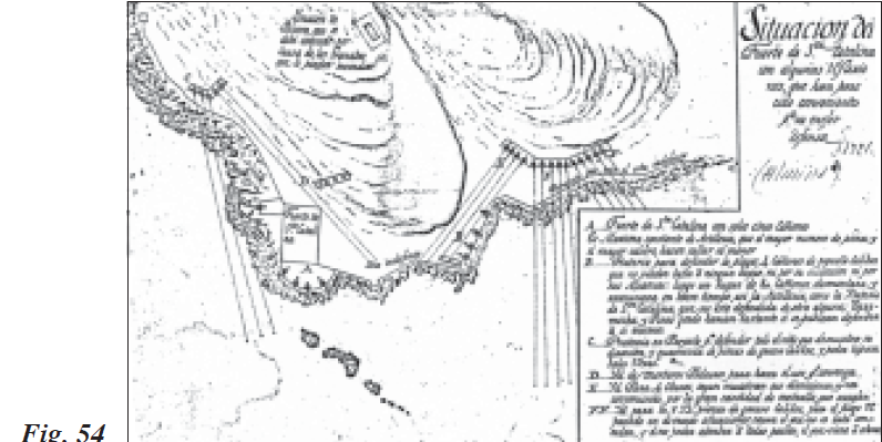 Se demolieron numerosas casas de particulares y se aprovecharon edificios para funciones que no les eran propias con el fin de readaptar distintos elementos defensivos, como la Catedral y el Palacio Viejo de los Gobernadores que estaban situados en la Plaza de África y que ahora sirvieron como cuarteles. Asimismo, en la Península de la Almina se proyectó el Fuerte de Santa Catalina mirando hacia la Bahía Norte o Mar de Gibraltar, en un paraje a propósito para defender la plaza de ataques navales, contando tan sólo con cinco cañones (Fig. 54). En la explicación de este plano aparecieron reflexiones poliorcéticas de primer orden, como que era máxima constante de artillería que el mayor número de piezas y el mayor calibre hacían callar al menor. Se razonaba también que la batería que defendía la playa próxima al fuerte estaba dotada de cuatro cañones de pequeño calibre, sin poder así batir a ningún buque ni por su situación ni por sus alcances, por lo que un navío de 80 cañones desmontaría y arruinaría en poco tiempo tanto la artillería como la Batería de Santa Catalina, pues no estaba defendida por ninguna otra, ya que las de Torremocha y Pineo Gordo hacían bastante si se defendían a sí mismas.