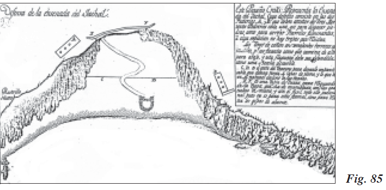 Desde finales de enero de 1751 fue nuevo gobernador de Ceuta Pedro Loaísa, Marqués de Matilla, Brigadier de los Reales Ejércitos y Teniente de Rey, que permaneció interinamente durante treinta y siete días en dicho cargo. Le sucedió Carlos Francisco de Croix, Teniente General de los Reales Ejércitos, que desde el principio de su mandato impuso las rondas nocturnas de todos los oficiales, así como frecuentes salidas marítimas sobre el río Negrón y río de Tetuán, y terrestres sobre los sitiadores de la plaza, acantonados a tiro de fusil de las fortificaciones más avanzadas. En este año actuaron en la plaza de Ceuta el Ingeniero Voluntario Ramón Panón30, mandando las Baterías de las Lunetas de San Felipe y la Reina, trabajando en los atrincheramientos, los Ingenieros Extraordinarios Luís Huet y Antonio Murga, que había sido nombrado el 12 de enero Director de la Academia de Matemáticas de Ceuta, y el Ingeniero 2ª Carlos Luján. Este último realizó el 2 de abril el plano, perfiles y vistas del Espigón de la Ribera, llamado también de la Coracha (Fig. 100) o Espigón de la Izquierda, demostrando sus ruinas, lo corroído, su cabeza y su canal hasta la peña. Recordemos que ésta estuvo fortificada en tiempos pretéritos, habiéndosele colocado incluso potencial artillero, como lo indicaban el encastre para asegurar su retreta y la zarpa y carretales que se proyectaban para evitar dicho paso, quedando su mayor profundidad durante la bajamar en dos pies y medio, y el resto hacia su cabeza en seco.