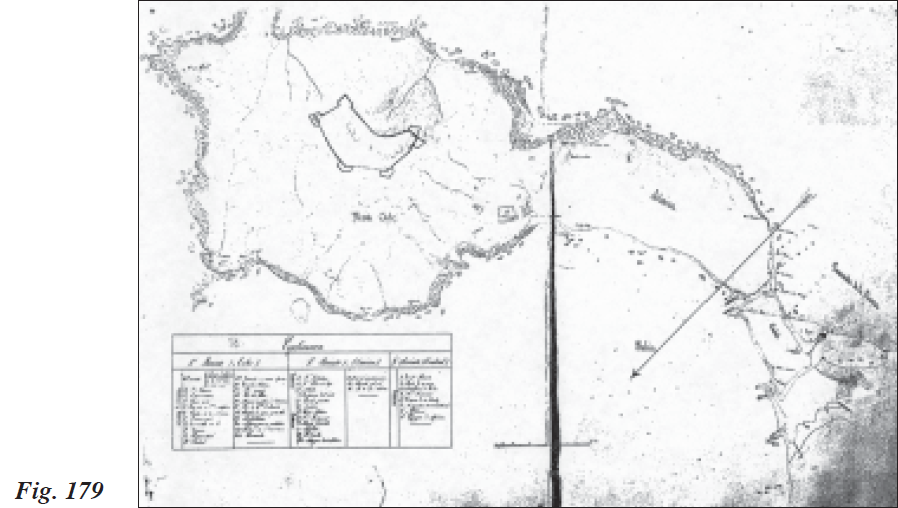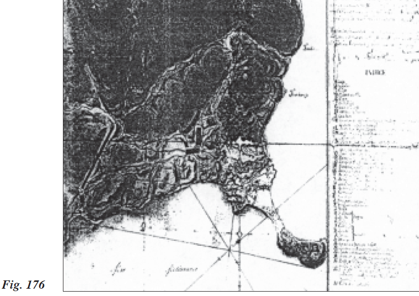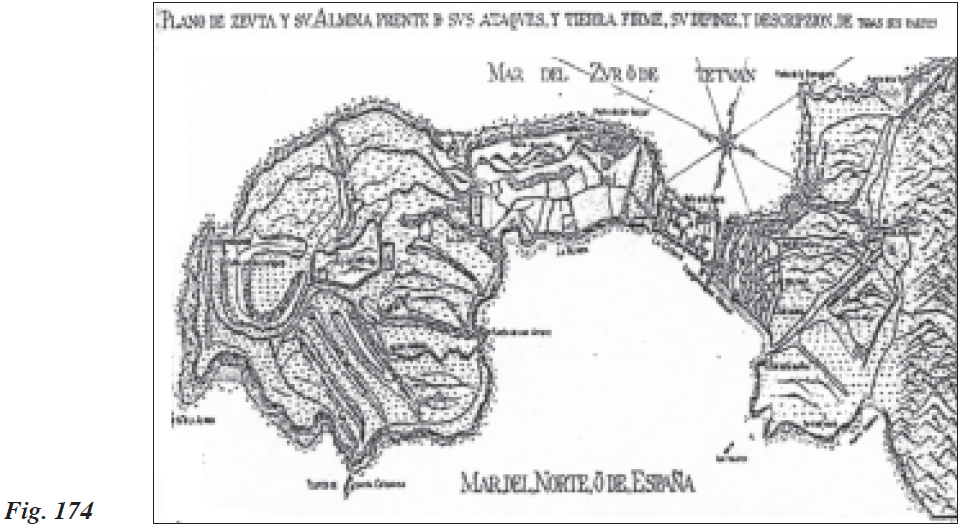 En otro plano del mismo año quedaban situados, entre el Mar del Sur o de Tetuán y el del Norte o de España, en el Campo Exterior el puesto y la punta de la Tramaquera, el Camino a Tetuán desde Castillejos, el Cuartel de los Alcaides, el Campamento de los moros, los Terrones, Ceuta la Vieja, Puerto Benítez, Torre del Vicario y las Baterías de la Marina, la nueva y la vieja, la del Chafariz, la del Morro y la del Chorrillo. En la ciudad, los Espigones del Albacar, el Bastión de los Mallorquines y la Playa de la Ribera; y en la Almina la Piedra de Don Gaspar, San Simón, el Molino de viento, Playa Hermosa, el Valle, la Cisterna o ribero, el Fuerte de San Amaro, la Fuente de la Teja, San Antonio, los Barrancos o riberos de Valdeaguas, del Codicino, de Santa Catalina y de la Teja; los Islotes de Santa Catalina, Punta Almina, el Barranco y Fuerte del Desnarigado y el Hacho (Fig. 174).