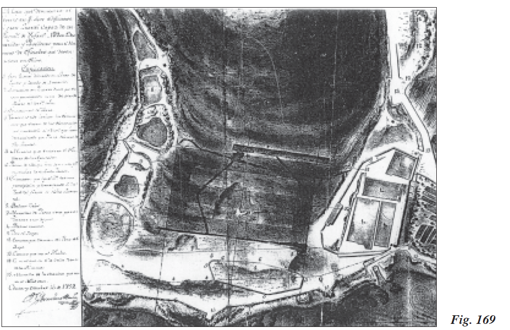 En el año 1723 estuvo también trabajando en la reedificación de la gran cisterna y balsas el Capitán Ingeniero 2ª Pedro Daubeterre, con proyectos donde se especificaban dos balsas hechas con paredes de cal y canto, empezadas a fabricar en 1722, y que ahora se habían ensanchado y profundizado, y necesitaban para su conclusión el alzamiento de paredes. Dichas balsas estaban llenas de agua y se señalaban también otras dos que tenían paredes de piedra seca y malecones de tierra que no habían recibido agua todavía, habiéndose ejecutado en el otoño (Figs. 160, 161, 162, 163 y 164). Daubeterre advertía que la peña en que estaban construidas estas balsas era muy porosa y llena de vetas, por lo que no conservaba su agua sino que sucesivamente transpiraba de una a otra hasta salir de la última. Si no llovía pronto se agotaría, lo que no sucedería hasta dentro de un año o más por el acopio de agua que se podría recoger en ellas. Las cisternas y pozos de la plaza descansaban, mientras la guarnición, los vecinos y los ganados se servían del agua que manaba de la última balsa, para lo cual había suficiente todavía. En definitiva, su proyecto presentaba pocas novedades a lo aportado por Verboom, tan sólo las murallas y revestimientos nuevos en las cisternas. Durante todo el año 1724 estuvo Daubeterre reedificando la gran cisterna, como mostraba un plano con lo ya finalizado y lo que faltaba por hacer (Figs.165 y 166).