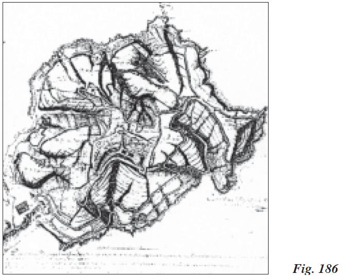 En este capítulo no he pretendido plantear si la arquitectura militar exigía un tipo de trazado gráfico determinado, y si éste necesariamente llevaba al estilo arquitectónico de referencia. En términos generales, cualquier estilo arquitectónico se podía representar gráficamente de muchos modos, pero la única relación cierta entre estilo gráfico y estilo arquitectónico ha de ser la de su contemporaneidad. Independientemente de su época de construcción, los edificios presentaban valores espaciales y volumétricos que llegaban a admitir representaciones diferenciadas en función del tema que se quisiera resaltar, en este caso el militar, y por esto a lo largo de nuestro trabajo de investigación hemos anotado ejemplos de edificios religiosos y civiles que fueron construidos según el estilo del momento, y otros modelos relativos a sistemas poliorcéticos que se apartaron de su enmarque cronológico-estilístico, para entrar en lo que denomino “lo singular castrense”, como marco o estilo propio del estamento militar que se valoraba por su temática y por estar dirigido a la salvaguarda de cada plaza militar. De aquí las continuas referencias que he indicado en planos que mostraban la ciudad vista tan sólo por y para militares, olvidando, y a veces eludiendo, la reseña de aspectos tan fundamentales como viviendas civiles, edificios eclesiásticos y vías urbanas y rurales.