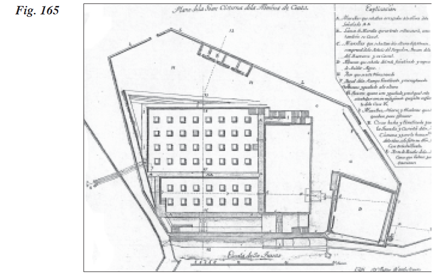 El Ingeniero 2ª Carlos Luján notificó al Marqués de la Ensenada a finales de mayo de 1751 que a los grandes aljibes se les iba todo el agua por sus cimientos, cuya reparación debió hacerse el año anterior antes de recibir el agua, pero que por su carencia y estando de acuerdo con el gobernador se aprobó que entrase el agua para cubrir cualquier emergencia que se pudiese dar. Para remediar este inconveniente se necesitaba, según Luján, hacer en sus suelos un plano de mampostería de un pie de alto con un hormigón de ocho pulgadas, y debido a que estos aljibes aún contaban con nueve pies de agua para abastecer a la guarnición y al pueblo, él no se atrevía a recomponerlos. También informaba que había suficiente agua en las Balsas de San Amaro y en los pozos de la Plaza de Armas para hacer frente a una eventual sequía. Luján trazó igualmente un plano a principios de junio, con el perfil y vista de un cuartel nuevo capaz para un regimiento de infantería y desterrados, situándolo a la izquierda de las Balsas y mirando de frente a la Marina Norte, y en su leyenda citaba la Gran Cisterna, el Pozo del Rayo y las Balsas de San Amaro (Fig. 168).