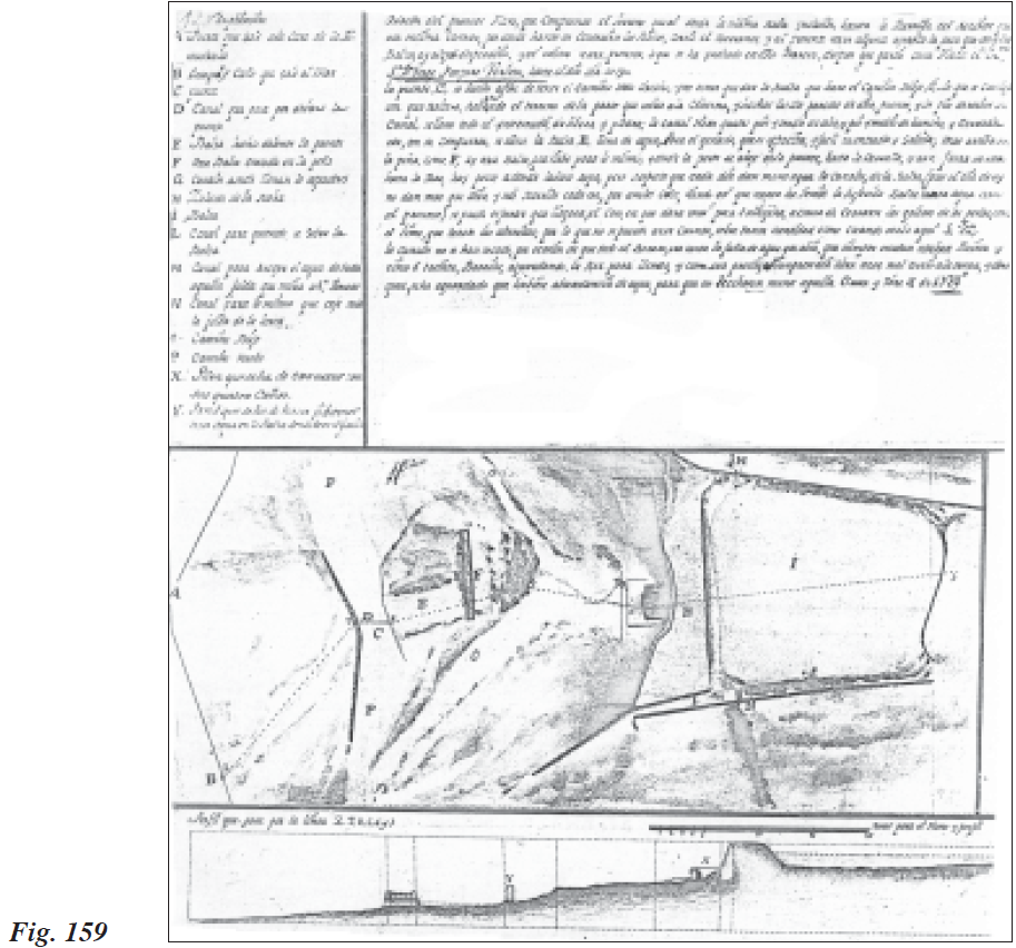Tenemos que reseñar que los ingenieros empleados en Flandes combinaban las características de la construcción en seco y las hidráulicas, siendo hábiles profesionales en trabajos de fortificación donde el agua representaba un importante papel. Aquí fue donde Verboom empezó a destacar y a alcanzar grandes experiencias en este campo del arte militar, proyectando en el Flandes marítimo y Mons tanto parapetos, caminos cubiertos, rebellines y hornaveque, como esclusas, canales y sistemas de abastecimiento de agua potable a fortificaciones y ciudades. Asimismo, estuvo en 1722 trabajando en las obras de fortificación y muelles de Málaga, elaborando incluso un proyecto para el abastecimiento de agua a dicha ciudad. En Ceuta realizó el plano y perfiles de un aljibe o cisterna antigua que se hallaba detrás de la plaza, en terrenos de la Almina, que recibía las aguas llovedizas que bajaban del Hacho, con el proyecto de restablecerla con bóvedas de ladrillos sobre pilares, y con capacidad para 1.303.102 arrobas de agua (Figs. 157 y 158).