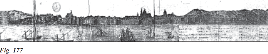 El último plano que hemos seleccionado de esta primera mitad de siglo es una vista frontal tomada desde la Bahía Norte, entre la Casa del Gobernador y Punta Almina, en el que se destacaban espacios militares, religiosos y civiles, como la Casa del Obispo, el Hospital Real, el Convento de San Francisco, la Casa del Gobernador, la explanada del Rebellín, el Puente de la Almina, el Convento de Trinitarios Descalzos, la Catedral, la Iglesia de Nuestra Señora, la Torre del Reloj, la Coracha, la Puerta Principal, la Muralla Real, el Torreón, el Espigón, la Puerta de la Sangre, las Fortificaciones Exteriores, Ceuta la Vieja, el Morro de la Viña y el Campo de los moros. Por entonces, y como consecuencia del sitio, se encontraba demolido el Medio Bastión de Santiago y se construían la Contraguardia y Caballero de Santiago, las Lunetas de la Reina, de San Luís y de San Felipe, la Contraguardia de San Javier, los Reductos de San Pablo y de San Jorge, el Rebellín de San Ignacio, las Lenguas de Sierpe y los Cuarteles a prueba de bomba arriados a la Muralla Real (Fig. 177). Tras la epidemia de peste bubónica sufrida por Ceuta en 1744, interesaba la reparación de algunos edificios por haber sido pasto de las llamas, como las Iglesias de San Antonio, del Valle y de San Amaro; el Hospital chico de San Amaro, el Hospital Real; los Cuerpos de Guardia del Pozo del Rayo, de las Balsas y de San Felipe, y las casas particulares de Juan Aguado, de María de Ledesma, de José de Linares, de Gregorio Parra y de Tomás Pinto; por un coste de 344.936 maravedíes, según la Junta Real de Obras.