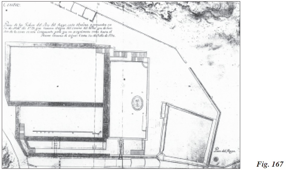Durante los siguientes veintiséis años no hubo novedades dignas de mención en estas obras hidráulicas. Ya en 1750, el gobernador y presidente de la Junta de Reales Obras de Ceuta, José de Orcasitas y Oleaga, se dirigió al Marqués de la Ensenada a finales de julio para detallarle la situación en que se encontraban las balsas, formándole el plano y perfil y advirtiéndole que, debido al nuevo camino que entonces se estaba haciendo en el Hacho, llegarían más aguas a dichos receptáculos. Orcasitas esperaba que pasase el Ministro a Fernando VI el acuerdo de dicha Junta de poder ampliar los muros para que no se experimentase como hasta el presente escasez de aguas (Fig. 167).
